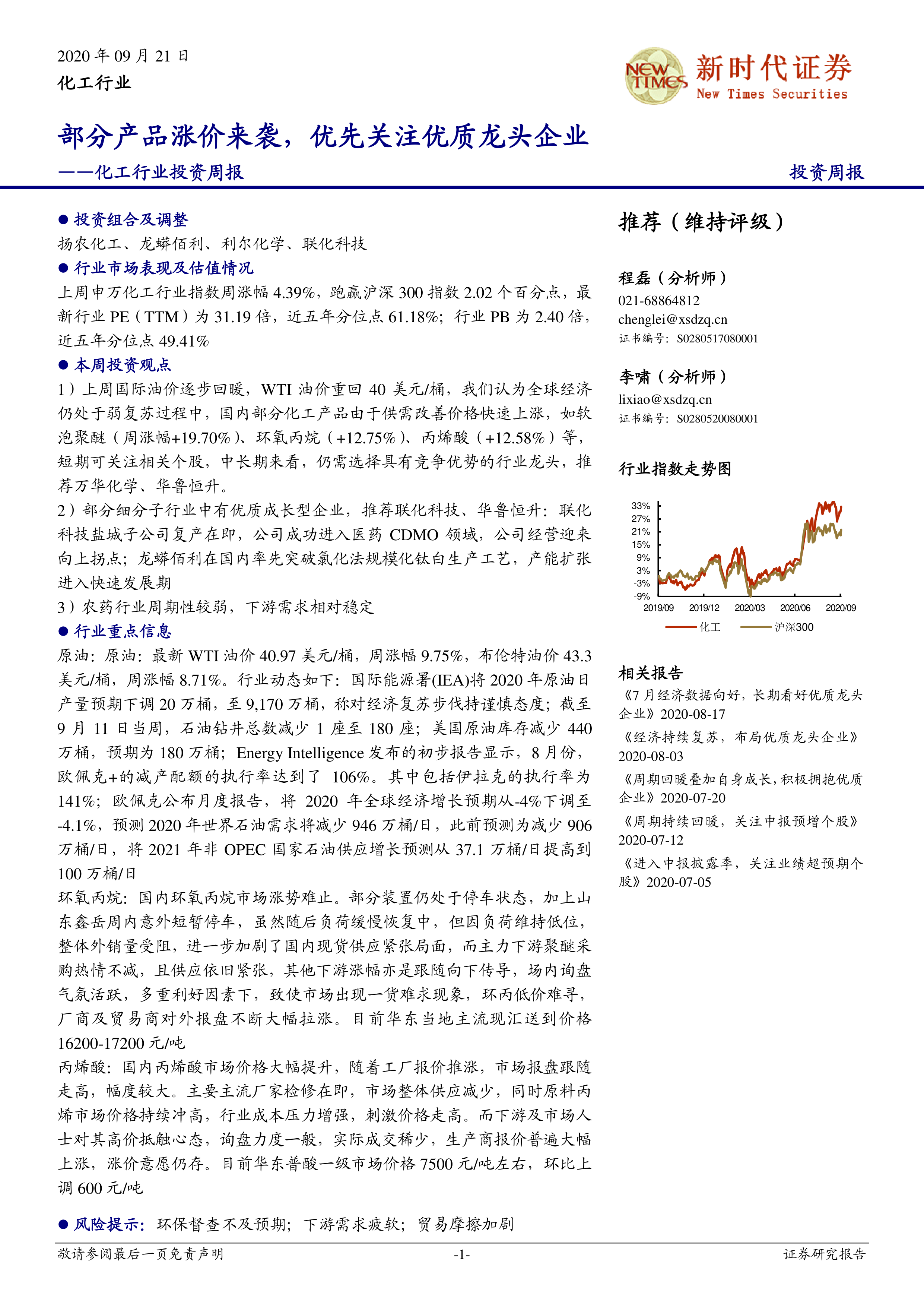本报告的核心观点是:2020年9月,部分化工产品价格上涨,行业景气度持续向好,建议关注行业龙头企业。主要原因是国际油价回暖,国内供需改善,以及部分细分子行业优质成长型企业的良好发展态势。报告推荐了扬农化工、龙蟒佰利、利尔化学、联化科技等优质龙头企业,并对部分化工产品价格波动进行了分析。