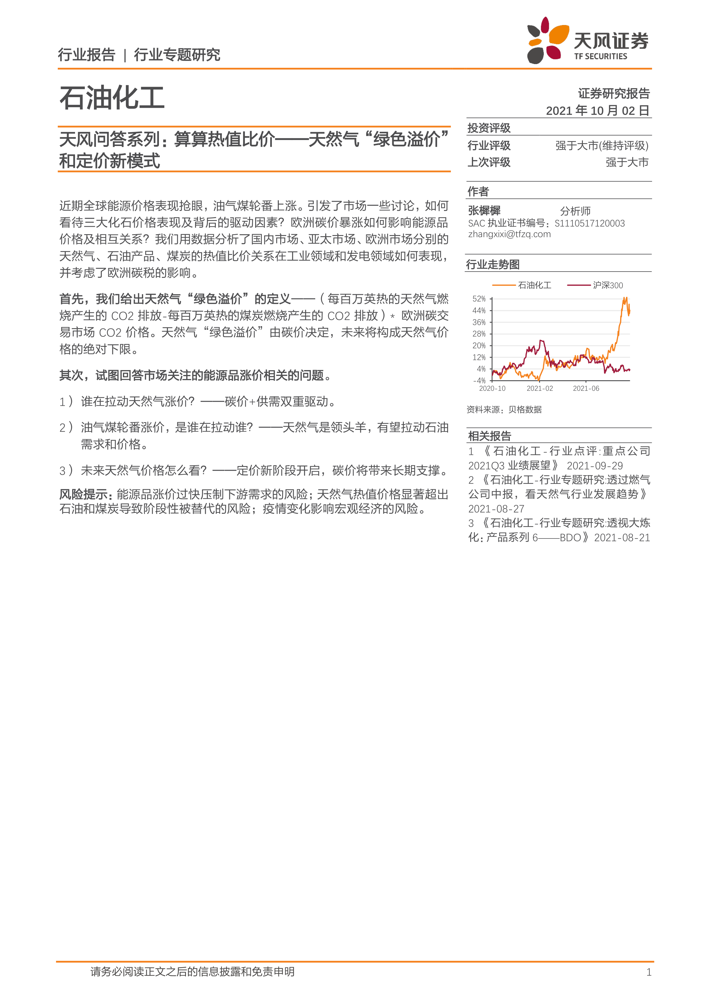 石油化工行业专题研究:天风问答系列:算算热值比价-天然气“绿色溢价”和定价新模式