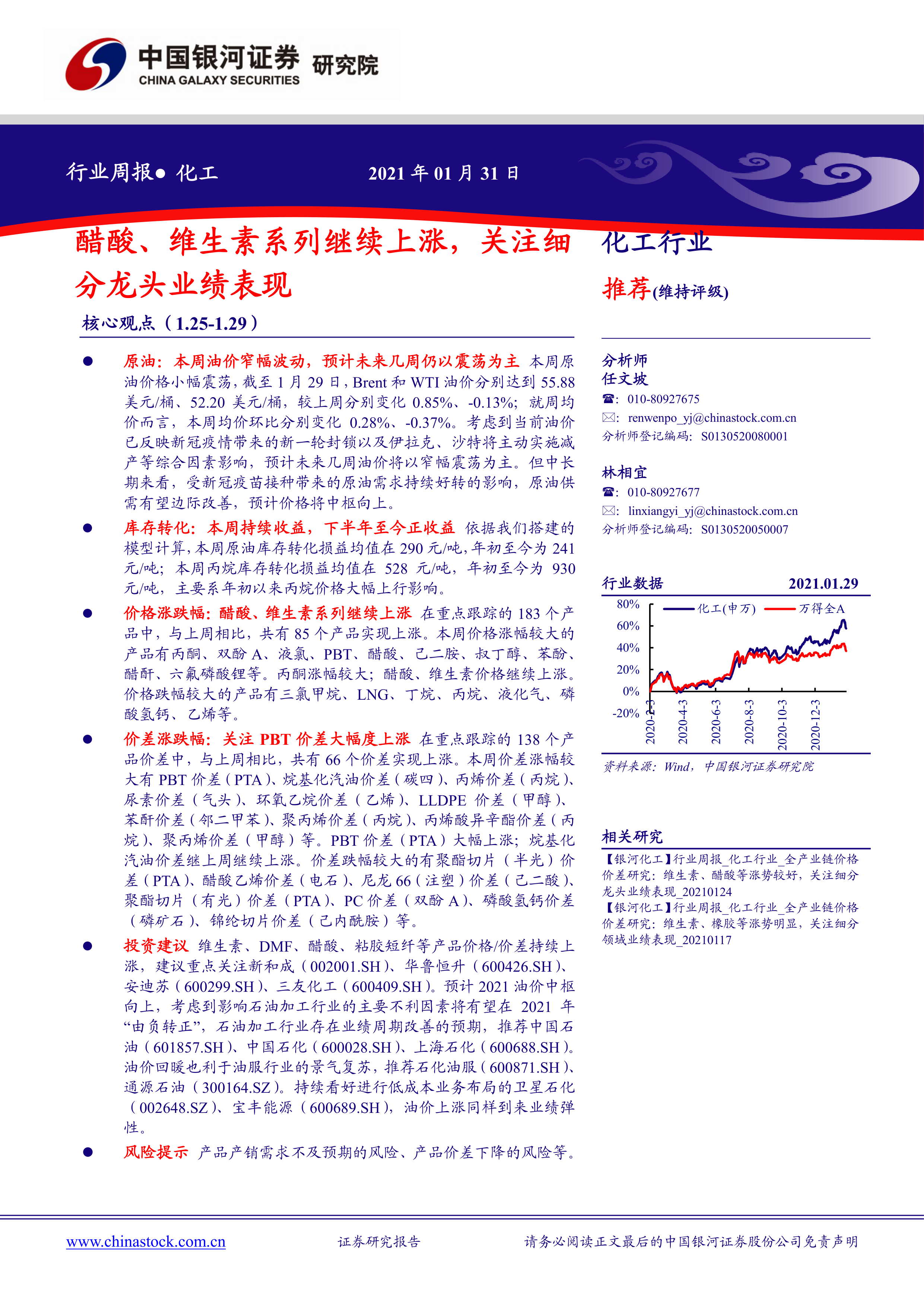 本报告对2021年1月25日至1月29日化工行业及原油市场进行了全面分析。报告指出,本周化工产品价格涨跌分化,部分产品价格上涨显著,而原油价格短期内震荡,但长期向好。基于此,报告建议投资者关注受益于化工产品价格上涨和原油价格回暖的相关企业,并提示了相应的投资风险。报告数据翔实,分析深入,为投资者提供了有价值的参考信息。 附录中详细列出了全产业链重点产品价格/价差数据,方便投资者进行更深入的研究。