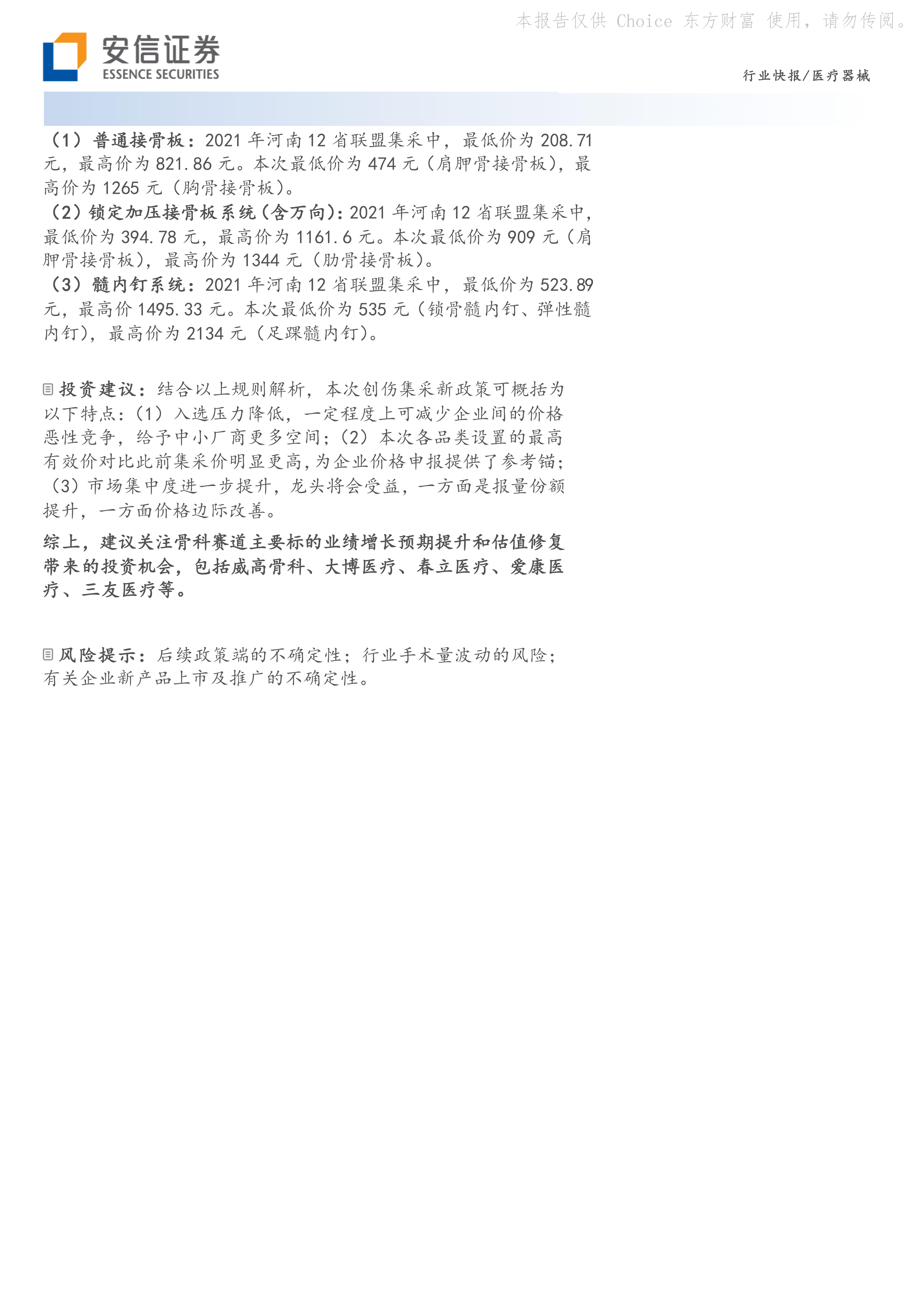 风险提示:后续政策端的不确定性;行业手术量波动的风险;有关企业新产品上市及推广的不确定性。