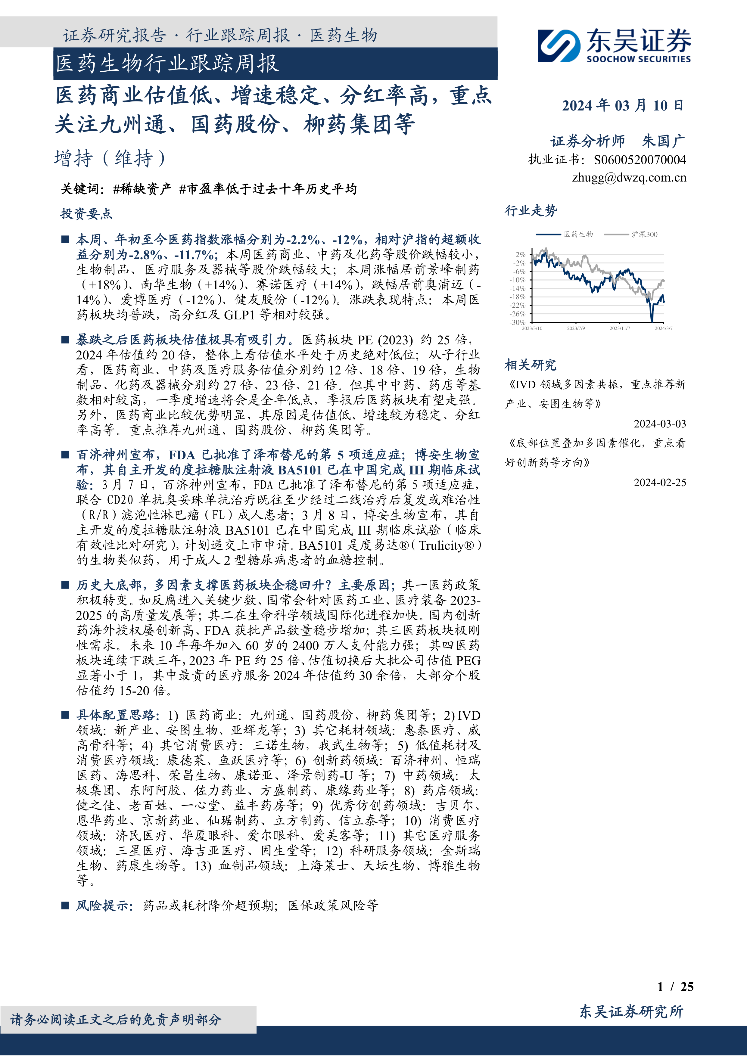 具体配置思路:1)医药商业:九州通、国药股份、柳药集团等;2)IVD领域:新产业、安图生物、亚辉龙等;3)其它耗材领域:惠泰医疗、威高骨科等;4)其它消费医疗:三诺生物,我武生物等;5)低值耗材及消费医疗领域:康德莱、鱼跃医疗等;6)创新药领域:百济神州、恒瑞医药、海思科、荣昌生物、康诺亚、泽景制药-U等;7)中药领域:太极集团、东阿阿胶、佐力药业、方盛制药、康缘药业等;8)药店领域:健之佳、老百姓、一心堂、益丰药房等;9)优秀仿创药领域:吉贝尔、恩华药业、京新药业、仙琚制药、立方制药、信立泰等;10)消费医疗领域:济民医疗、华厦眼科、爱尔眼科、爱美客等;11)其它医疗服务领域:三星医疗、海吉亚医疗、固生堂等;12)科研服务领域:金斯瑞生物、药康生物等。13)血制品领域:上海莱士、天坛生物、博雅生物等。