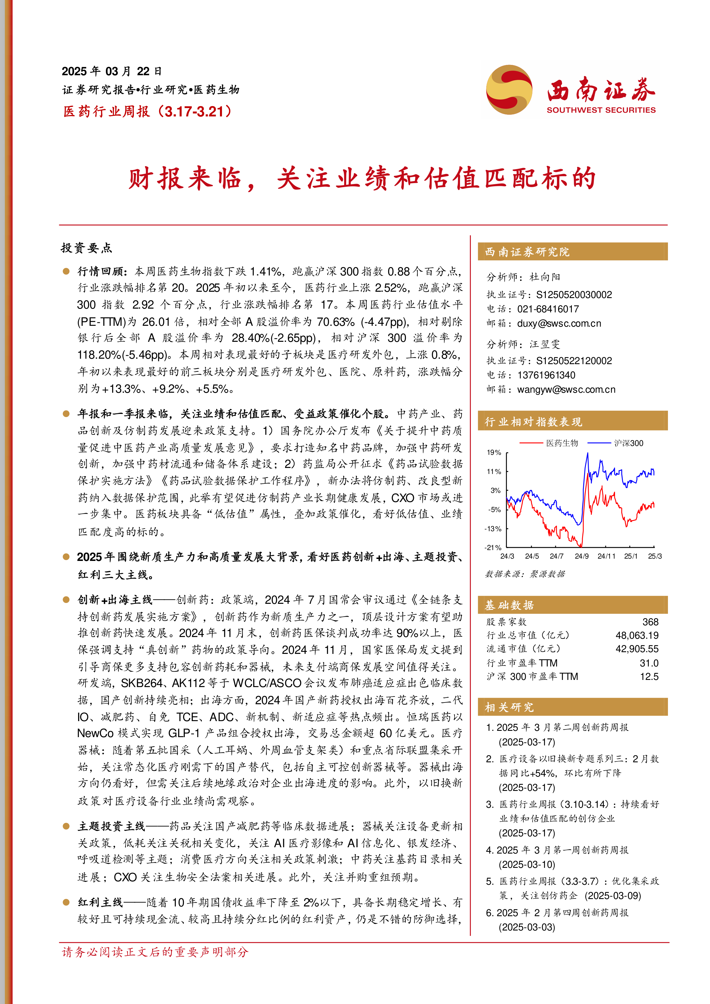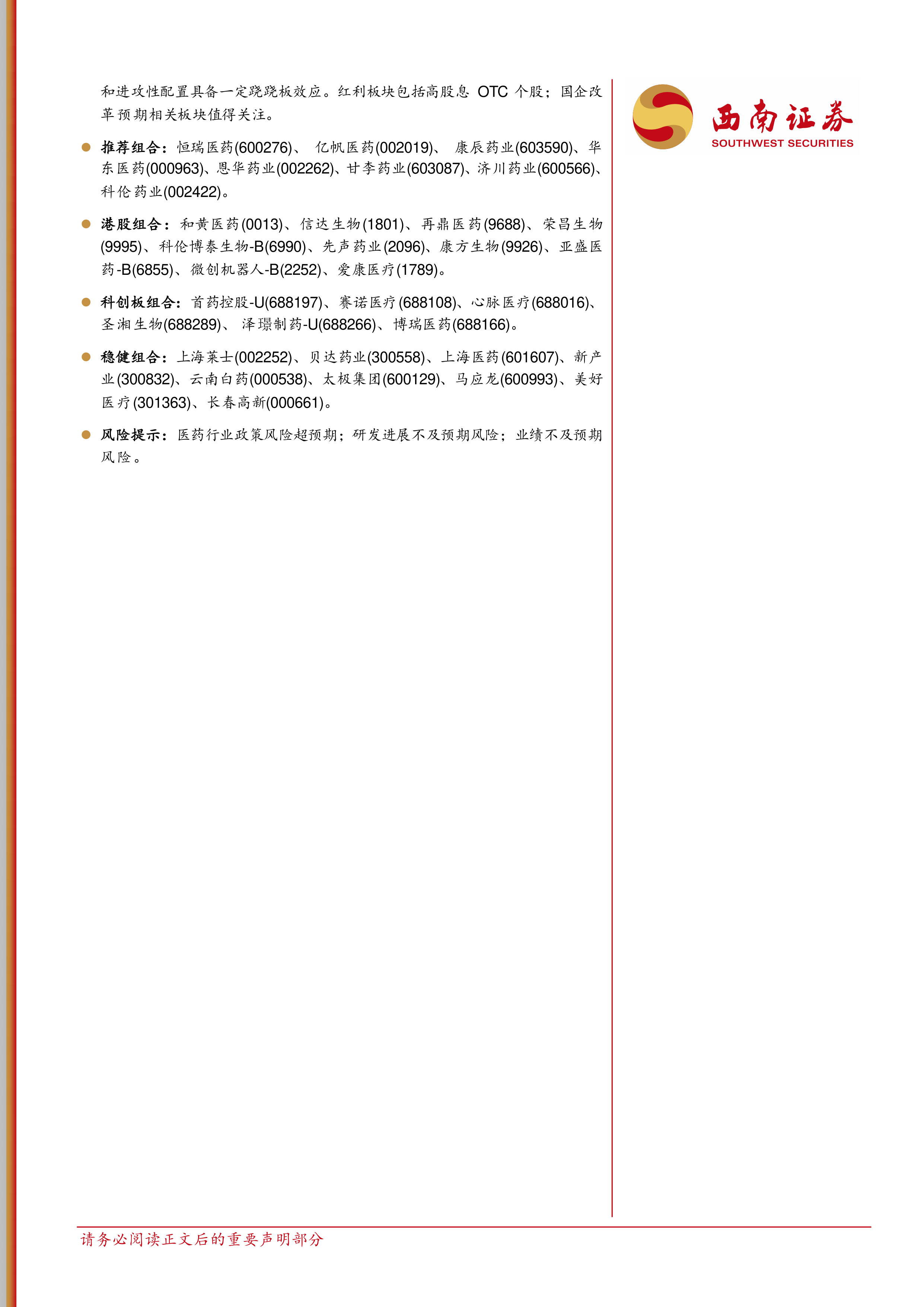 风险提示:医药行业政策风险超预期;研发进展不及预期风险;业绩不及预期风险。