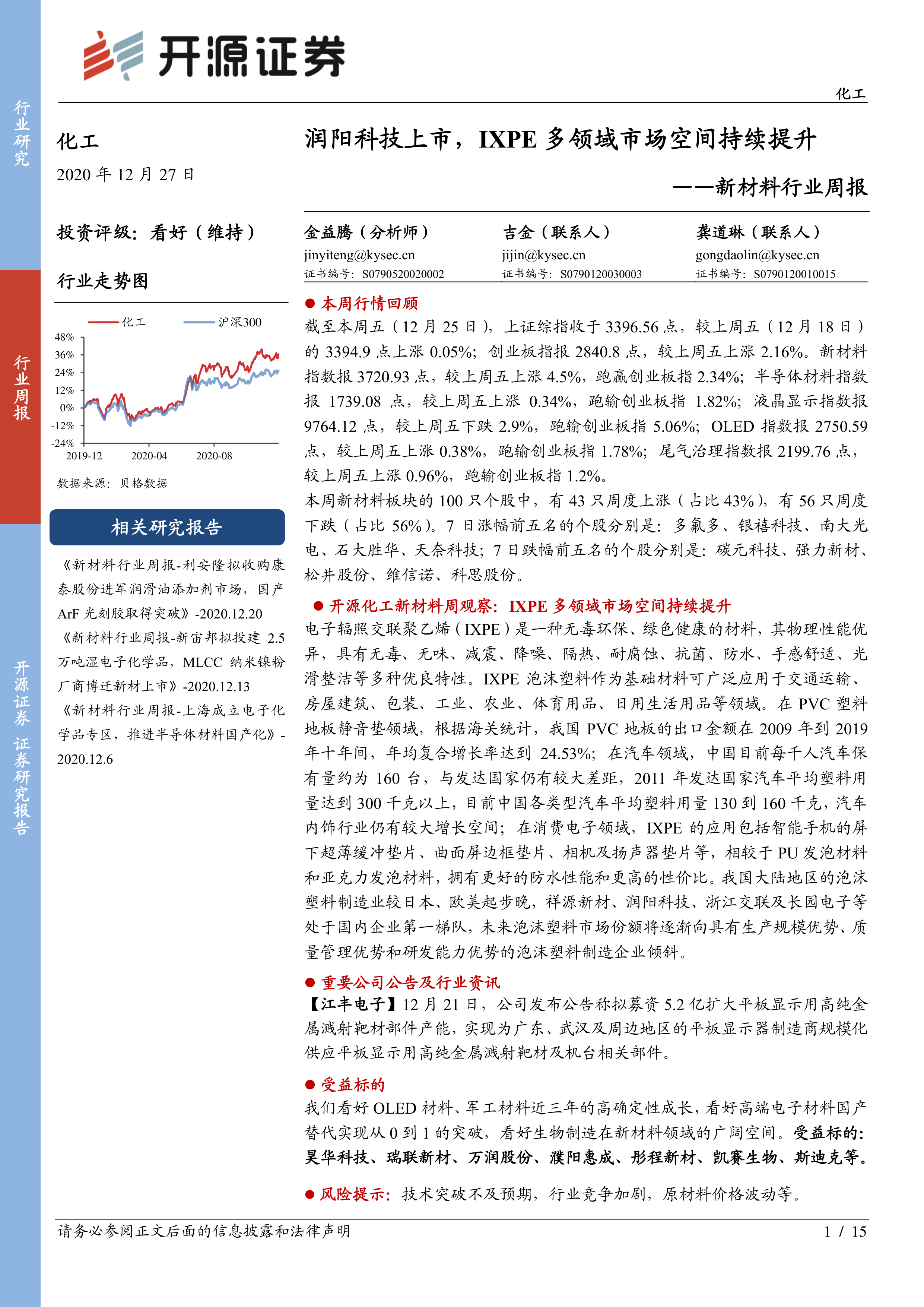 新材料行业周报:润阳科技上市,IXPE多领域市场空间持续提升