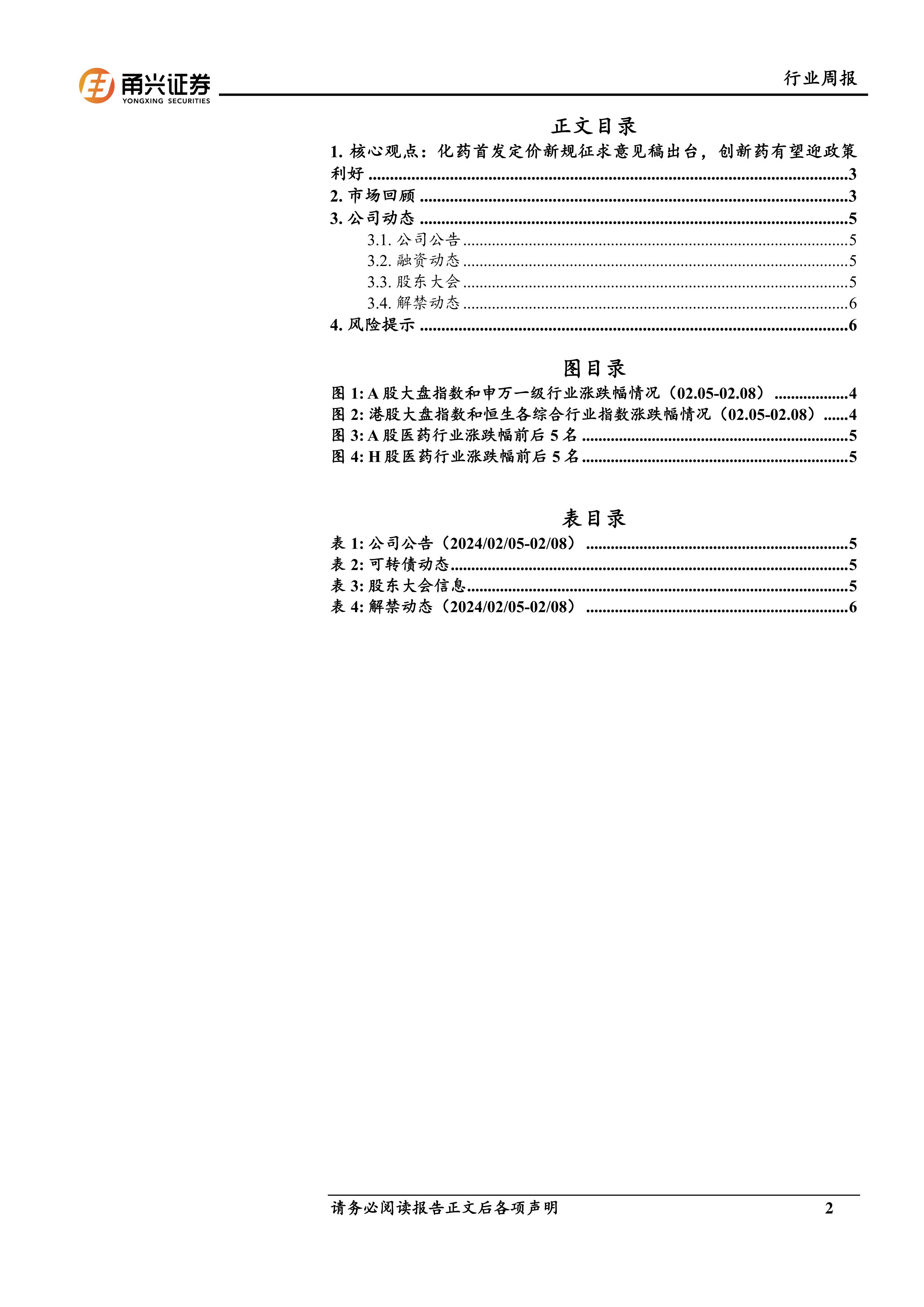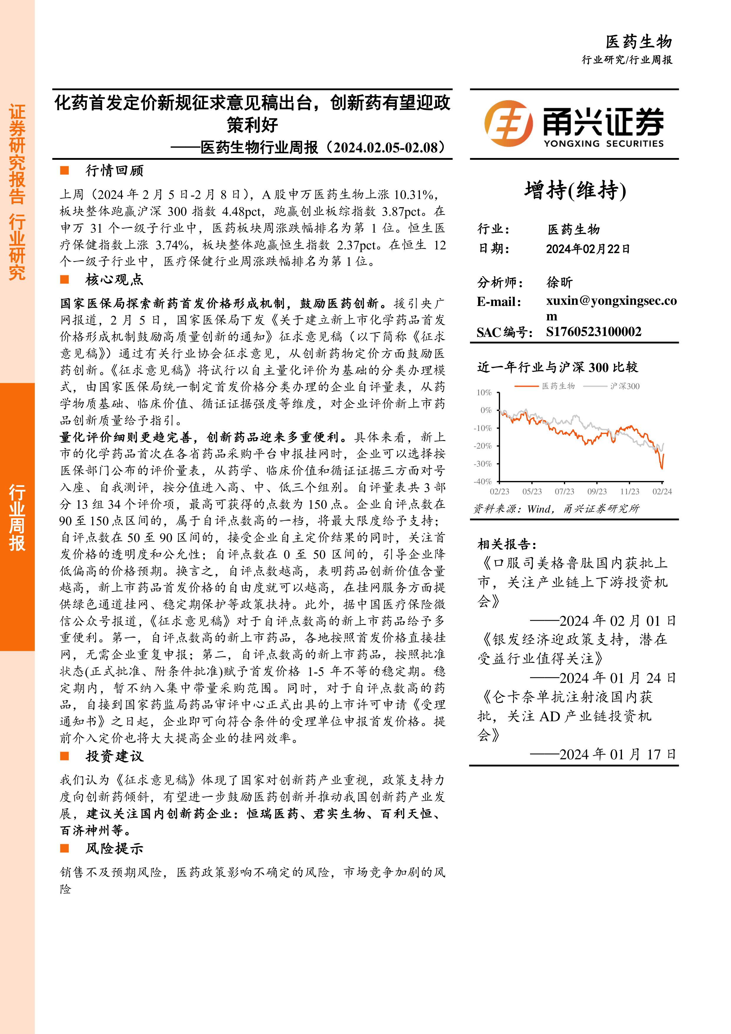 本报告分析了2024年2月5日至2月8日医药生物行业的市场表现和公司动态,重点关注了国家医保局发布的关于新上市化学药品首发价格形成机制的征求意见稿。该政策通过量化评价体系,对创新药给予更强的政策支持,预计将推动中国创新药产业发展,利好国内创新药企业。 报告同时提示了潜在的市场风险,提醒投资者谨慎投资。 报告数据翔实,分析客观,为投资者提供了有价值的参考信息。