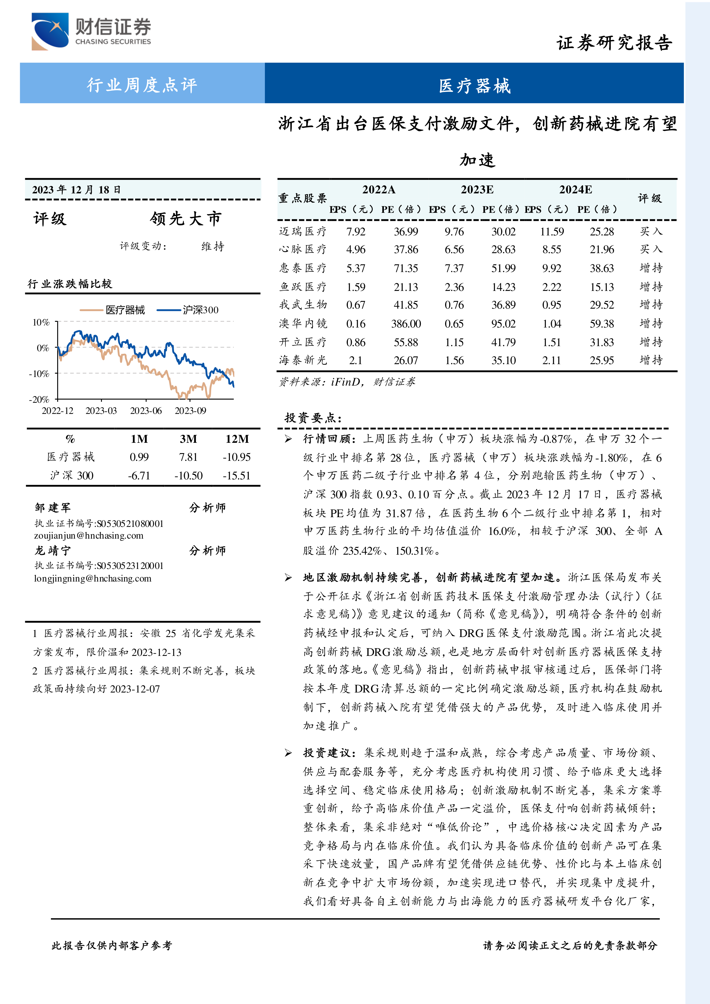 医疗器械行业周度点评:浙江省出台医保支付激励文件,创新药械进院有望加速