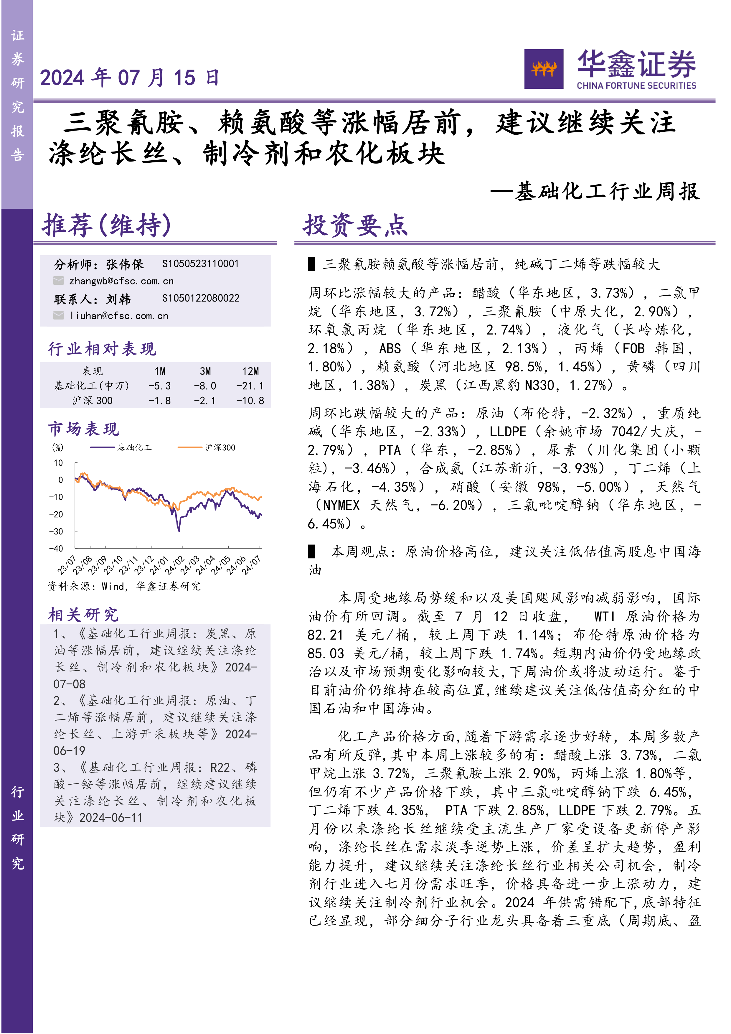基础化工行业周报:三聚氰胺、赖氨酸等涨幅居前,建议继续关注涤纶长丝、制冷剂和农化板块