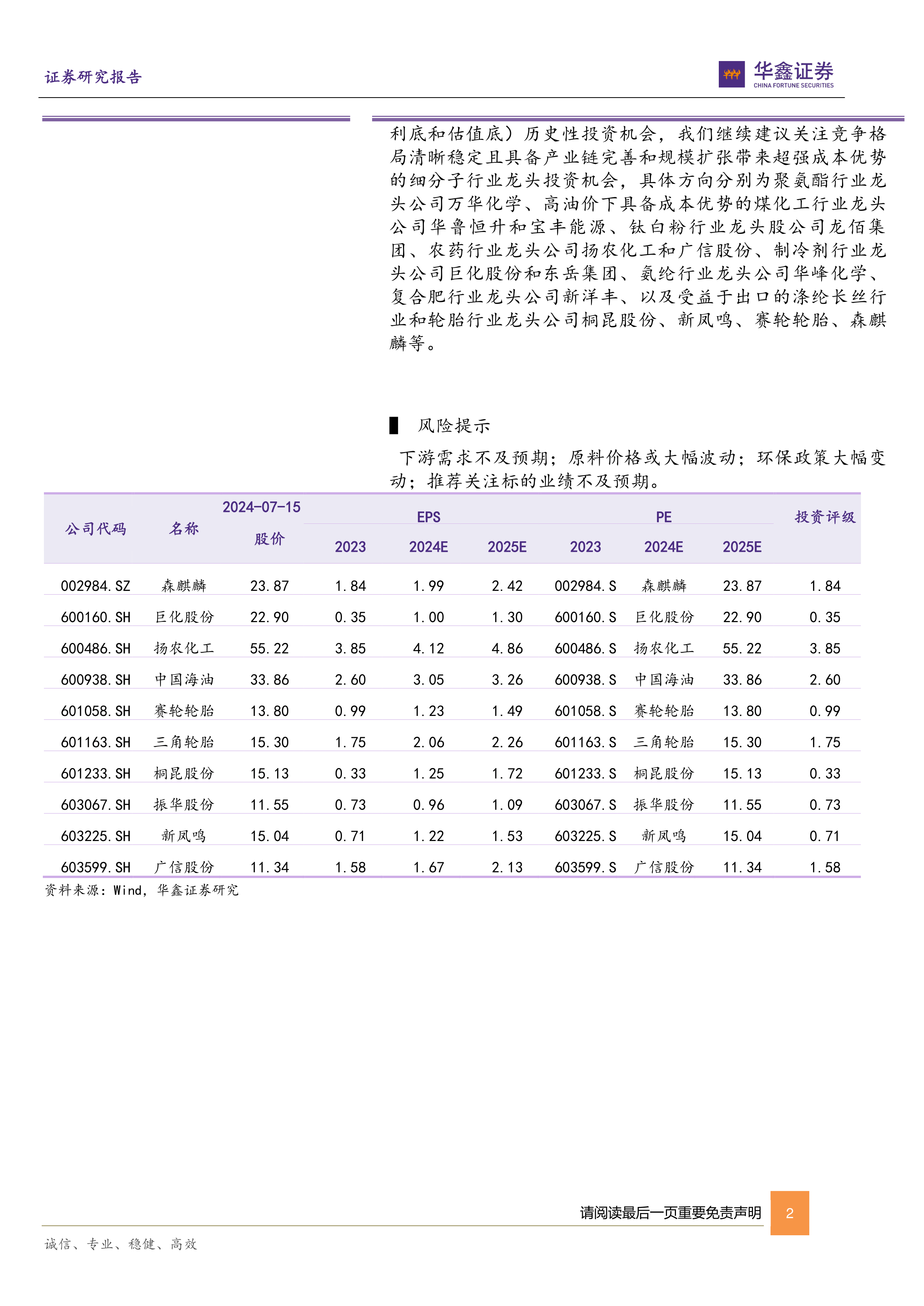 报告最后列出了潜在的投资风险,包括下游需求不及预期、原料价格大幅波动、环保政策大幅变动以及推荐关注标的业绩不及预期等。