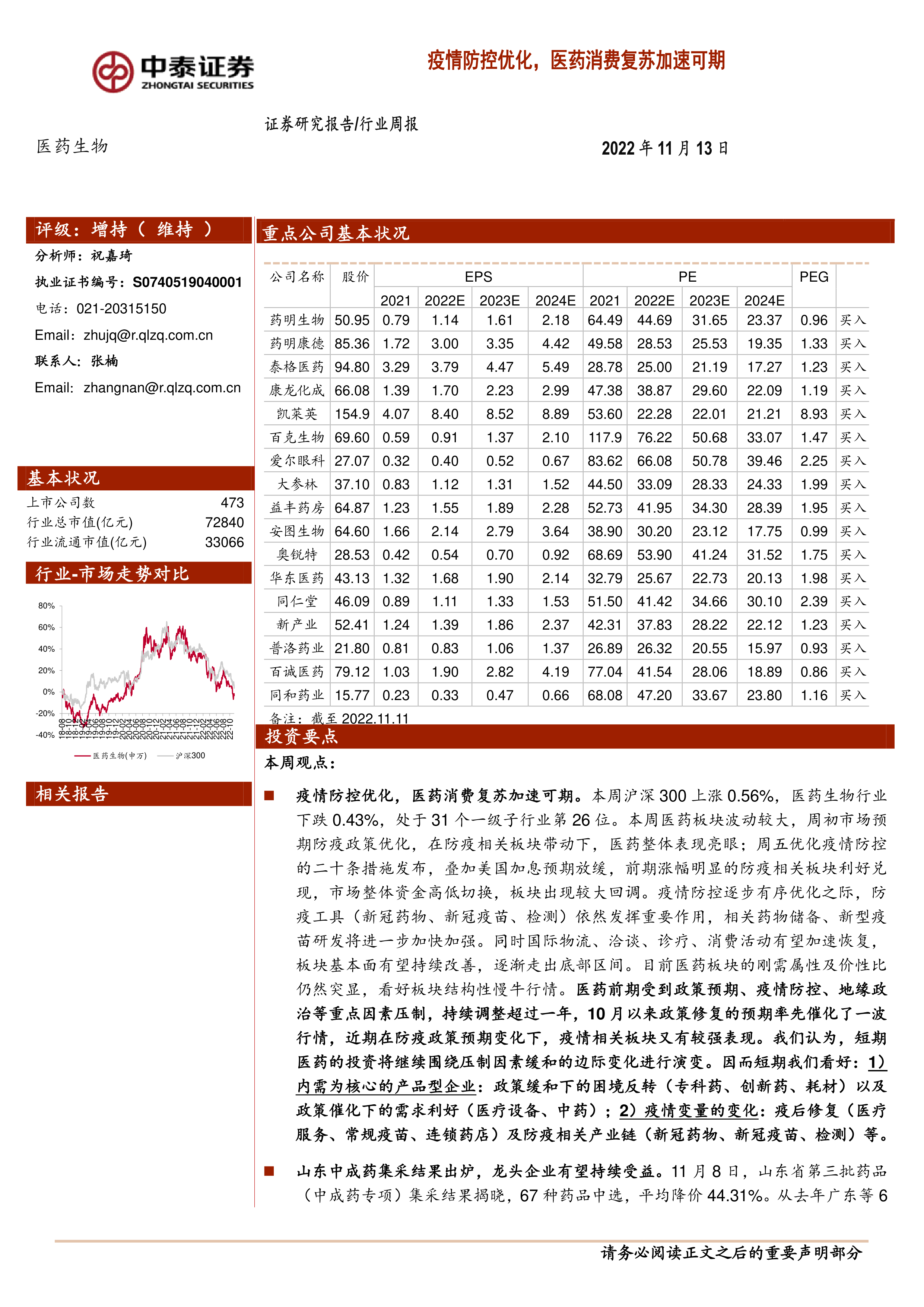 医药生物行业周报:疫情防控优化,医药消费复苏加速可期