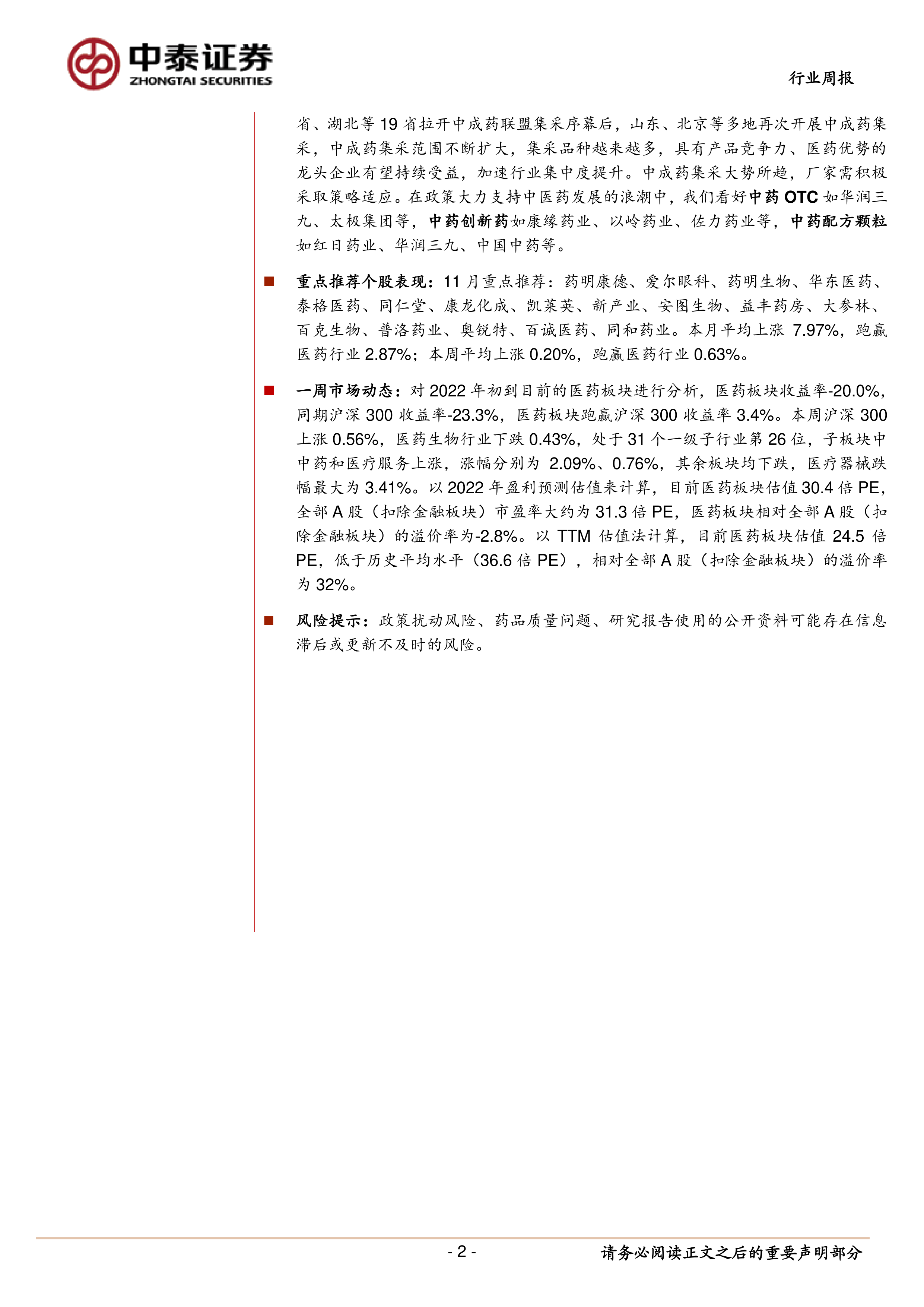 疫情防控优化,医药消费复苏加速可期。本周沪深300上涨0.56%,医药生物行业下跌0.43%,处于31个一级子行业第26位。本周医药板块波动较大,周初市场预期防疫政策优化,在防疫相关板块带动下,医药整体表现亮眼;周五优化疫情防控的二十条措施发布,叠加美国加息预期放缓,前期涨幅明显的防疫相关板块利好兑现,市场整体资金高低切换,板块出现较大回调。疫情防控逐步有序优化之际,防疫工具(新冠药物、新冠疫苗、检测)依然发挥重要作用,相关药物储备、新型疫苗研发将进一步加快加强。同时国际物流、洽谈、诊疗、消费活动有望加速恢复,板块基本面有望持续改善,逐渐走出底部区间。目前医药板块的刚需属性及价性比仍然突显,看好板块结构性慢牛行情。医药前期受到政策预期、疫情防控、地缘政治等重点因素压制,持续调整超过一年,10月以来政策修复的预期率先催化了一波行情,近期在防疫政策预期变化下,疫情相关板块又有较强表现。我们认为,短期医药的投资将继续围绕压制因素缓和的边际变化进行演变。因而短期我们看好:1)内需为核心的产品型企业:政策缓和下的困境反转(专科药、创新药、耗材)以及政策催化下的需求利好(医疗设备、中药);2)疫情变量的变化:疫后修复(医疗服务、常规疫苗、连锁药店)及防疫相关产业链(新冠药物、新冠疫苗、检测)等。