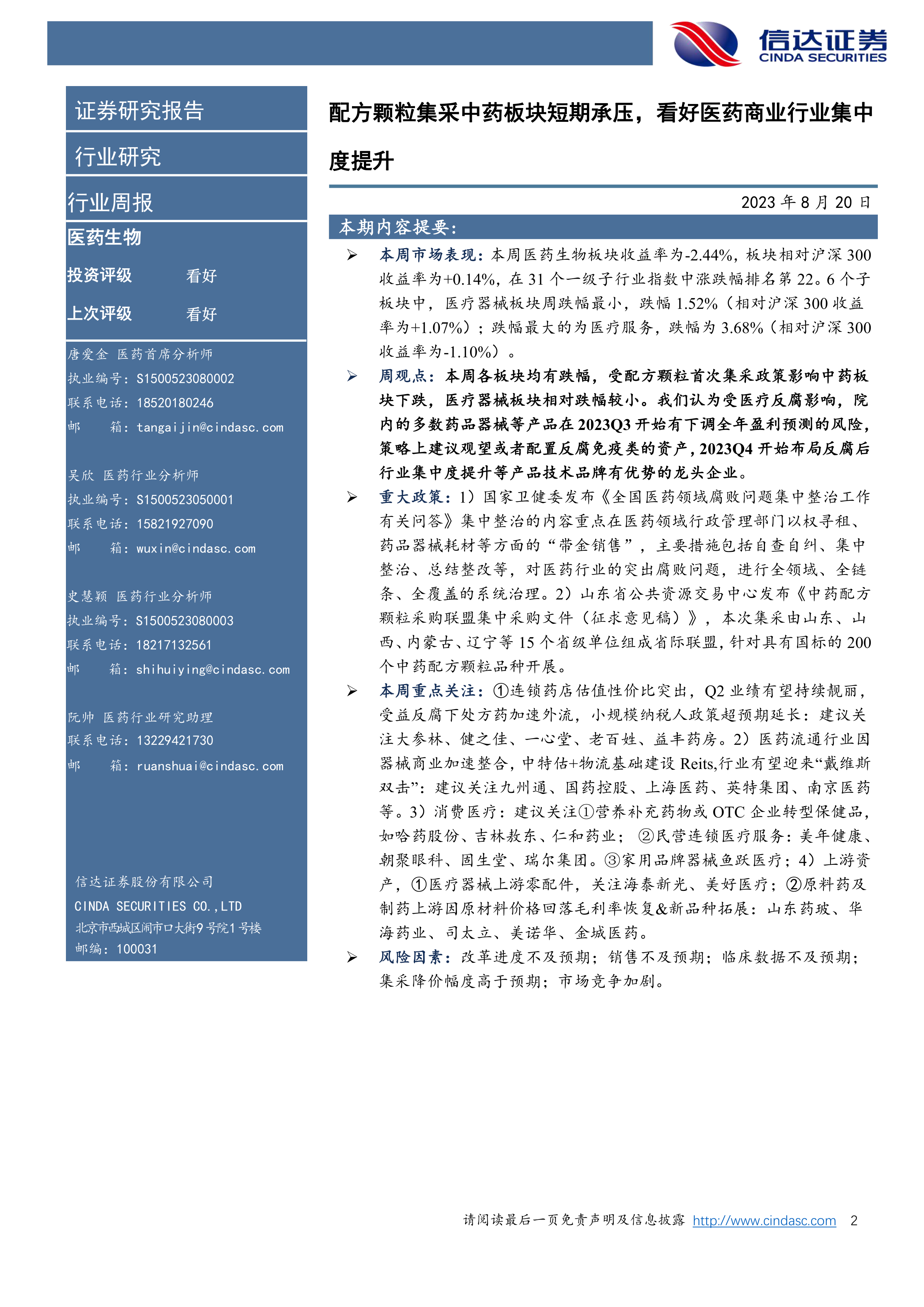 本周重点关注:①连锁药店估值性价比突出,Q2业绩有望持续靓丽,受益反腐下处方药加速外流,小规模纳税人政策超预期延长:建议关注大参林、健之佳、一心堂、老百姓、益丰药房。2)医药流通行业因器械商业加速整合,中特估+物流基础建设Reits,行业有望迎来“戴维斯双击”:建议关注九州通、国药控股、上海医药、英特集团、南京医药等。3)消费医疗:建议关注①营养补充药物或OTC企业转型保健品,如哈药股份、吉林敖东、仁和药业;②民营连锁医疗服务:美年健康、朝聚眼科、固生堂、瑞尔集团。③家用品牌器械鱼跃医疗;4)上游资产,①医疗器械上游零配件,关注海泰新光、美好医疗;②原料药及制药上游因原材料价格回落毛利率恢复&新品种拓展:山东药玻、华海药业、司太立、美诺华、金城医药。