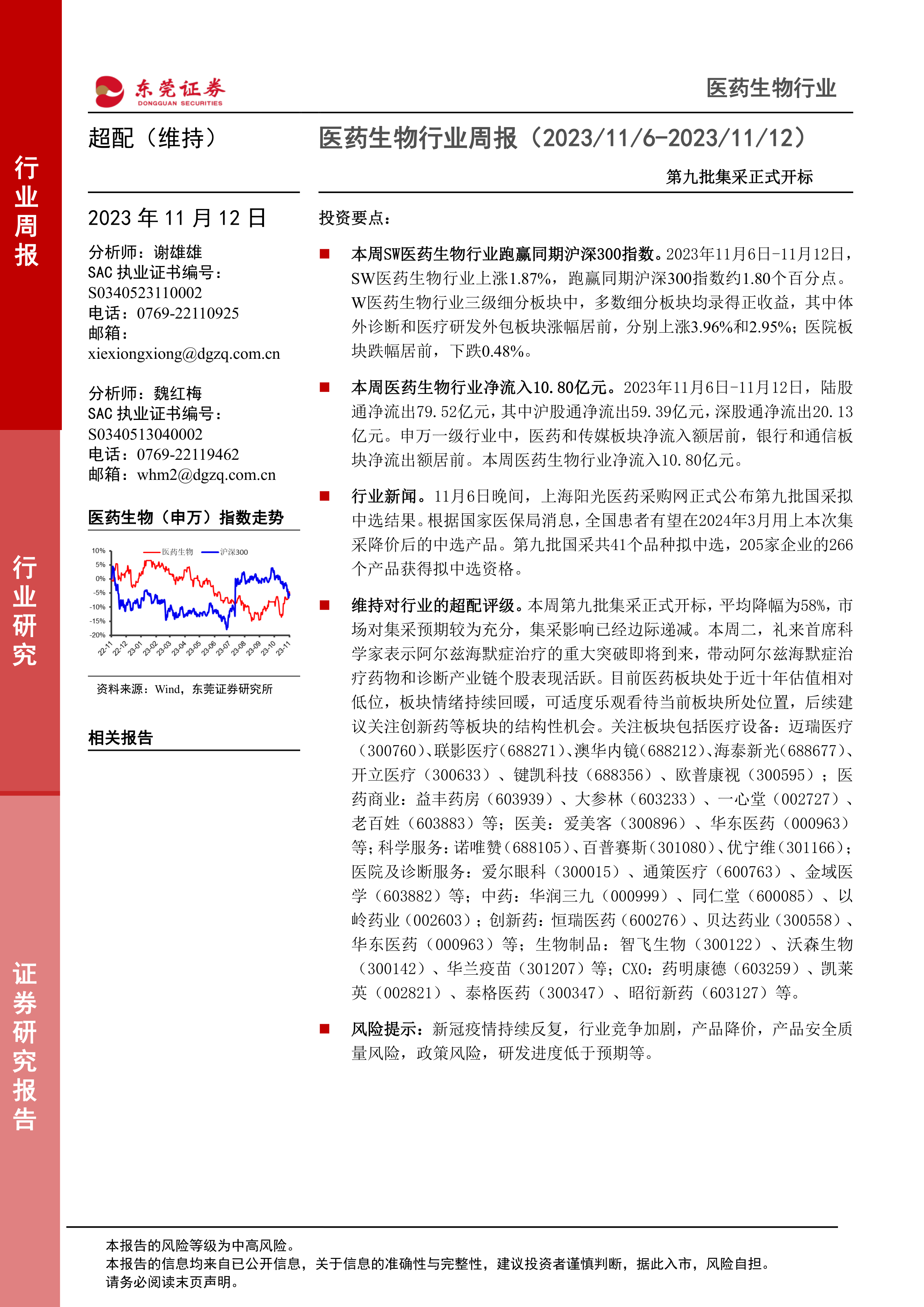 本报告对2023年11月6日至11月12日医药生物行业的表现进行了全面分析。尽管第九批国家集采对行业短期盈利能力造成一定影响,但市场预期已较为充分,其影响边际递减。 阿尔兹海默症治疗领域的潜在突破以及行业估值处于近十年相对低位,为行业长期发展提供了有力支撑。 报告维持对医药生物行业的超配评级,并建议投资者关注创新药等细分板块的结构性投资机会,同时需谨慎评估潜在风险。 报告数据主要来自Wind和东莞证券研究所,投资者需谨慎判断,风险自担。