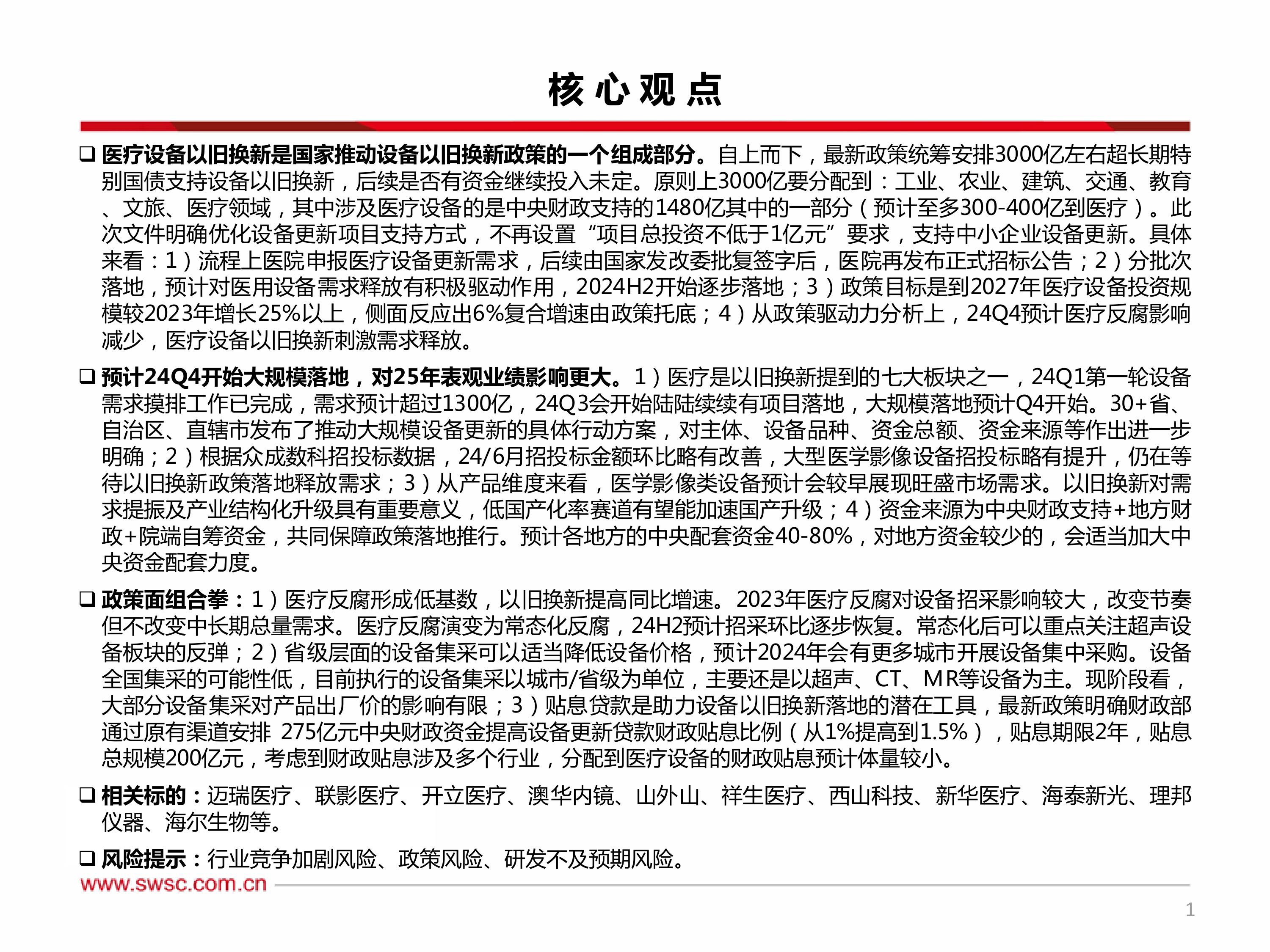 医疗设备以旧换新是国家推动设备以旧换新政策的一个组成部分。自上而下,最新政策统筹安排3000亿左右超长期特别国债支持设备以旧换新,后续是否有资金继续投入未定。原则上3000亿要分配到:工业、农业、建筑、交通、教育、文旅、医疗领域,其中涉及医疗设备的是中央财政支持的1480亿其中的一部分(预计至多300-400亿到医疗)。此次文件明确优化设备更新项目支持方式,不再设置“项目总投资不低于1亿元”要求,支持中小企业设备更新。具体来看:1)流程上医院申报医疗设备更新需求,后续由国家发改委批复签字后,医院再发布正式招标公告;2)分批次落地,预计对医用设备需求释放有积极驱动作用,2024H2开始逐步落地;3)政策目标是到2027年医疗设备投资规模较2023年增长25%以上,侧面反应出6%复合增速由政策托底;4)从政策驱动力分析上,24Q4预计医疗反腐影响减少,医疗设备以旧换新刺激需求释放。