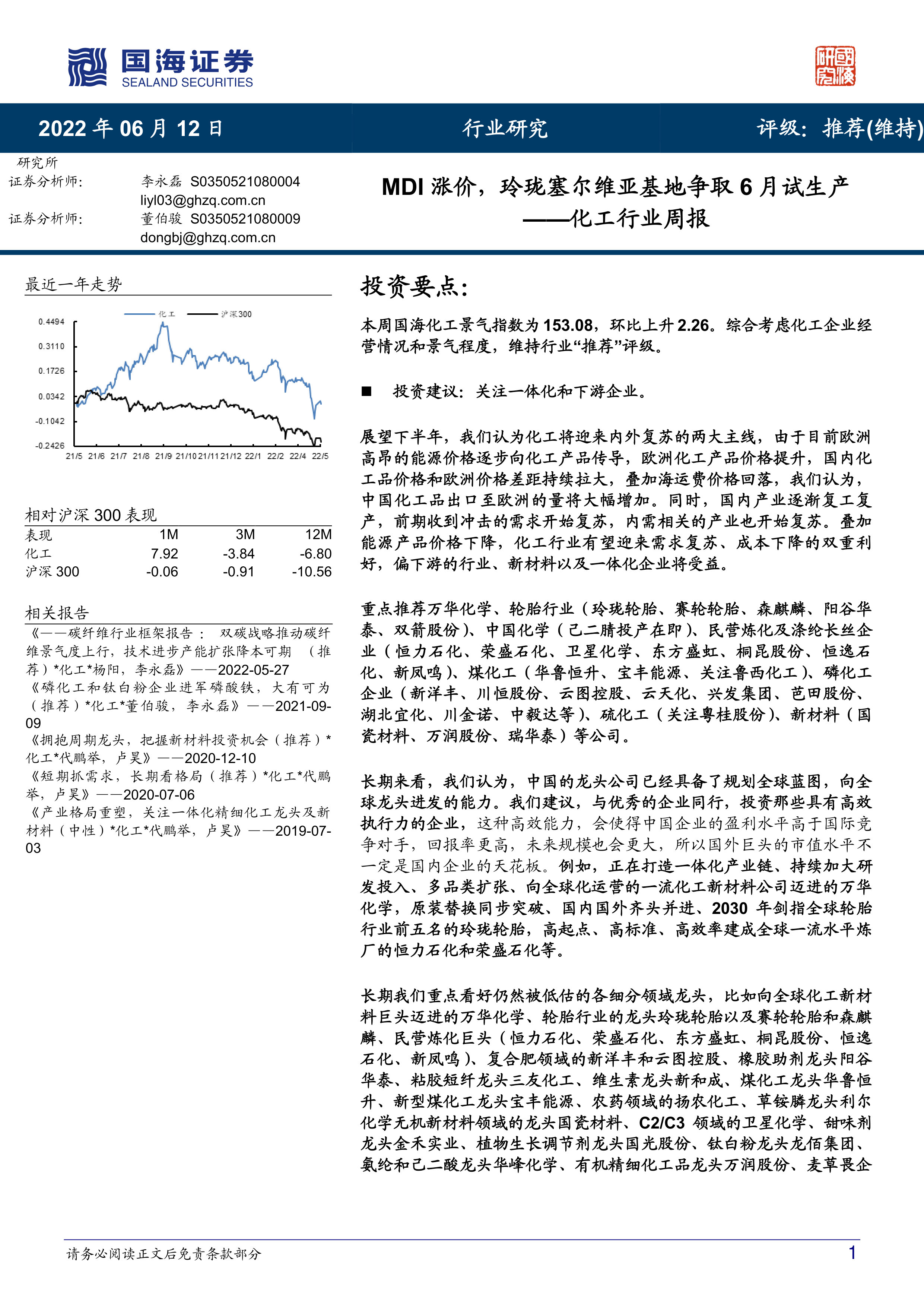 本报告的核心观点是:基于2022年6月12日的数据和市场观察,维持化工行业“推荐”评级,并重点关注一体化和下游企业。 主要理由如下: