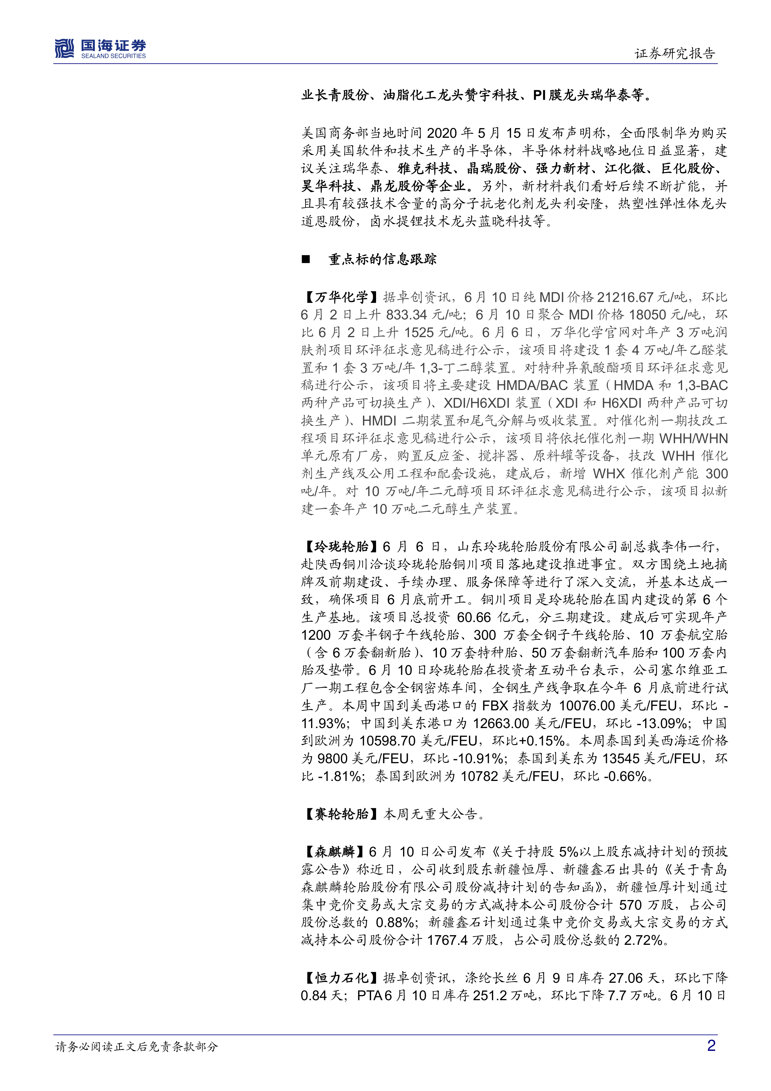 重点推荐万华化学、轮胎行业(玲珑轮胎、赛轮轮胎、森麒麟、阳谷华泰、双箭股份)、中国化学(己二腈投产在即)、民营炼化及涤纶长丝企业(恒力石化、荣盛石化、卫星化学、东方盛虹、桐昆股份、恒逸石化、新凤鸣)、煤化工(华鲁恒升、宝丰能源、关注鲁西化工)、磷化工企业(新洋丰、川恒股份、云图控股、云天化、兴发集团、芭田股份、湖北宜化、川金诺、中毅达等)、硫化工(关注粤桂股份)、新材料(国瓷材料、万润股份、瑞华泰)等公司。