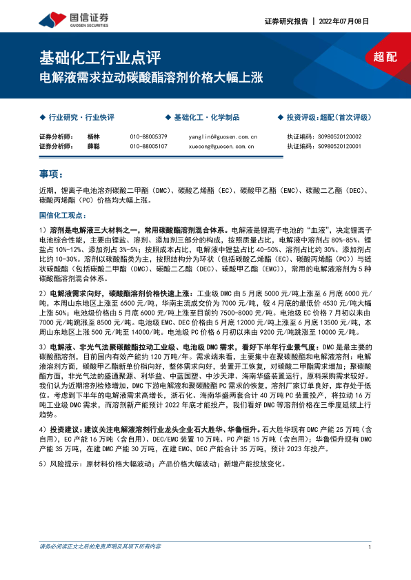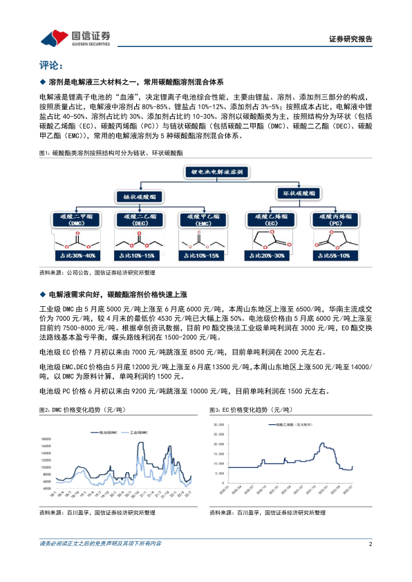 本报告的核心观点是:由于锂离子电池电解液需求的强劲增长,导致碳酸酯溶剂(DMC、EC、EMC、DEC、PC)价格大幅上涨。 国信证券预计这种上涨趋势将在三季度持续,并建议投资者关注电解液溶剂行业龙头企业石大胜华和华鲁恒升。 报告同时指出了潜在的风险因素,例如原材料价格波动和新增产能投放变化。