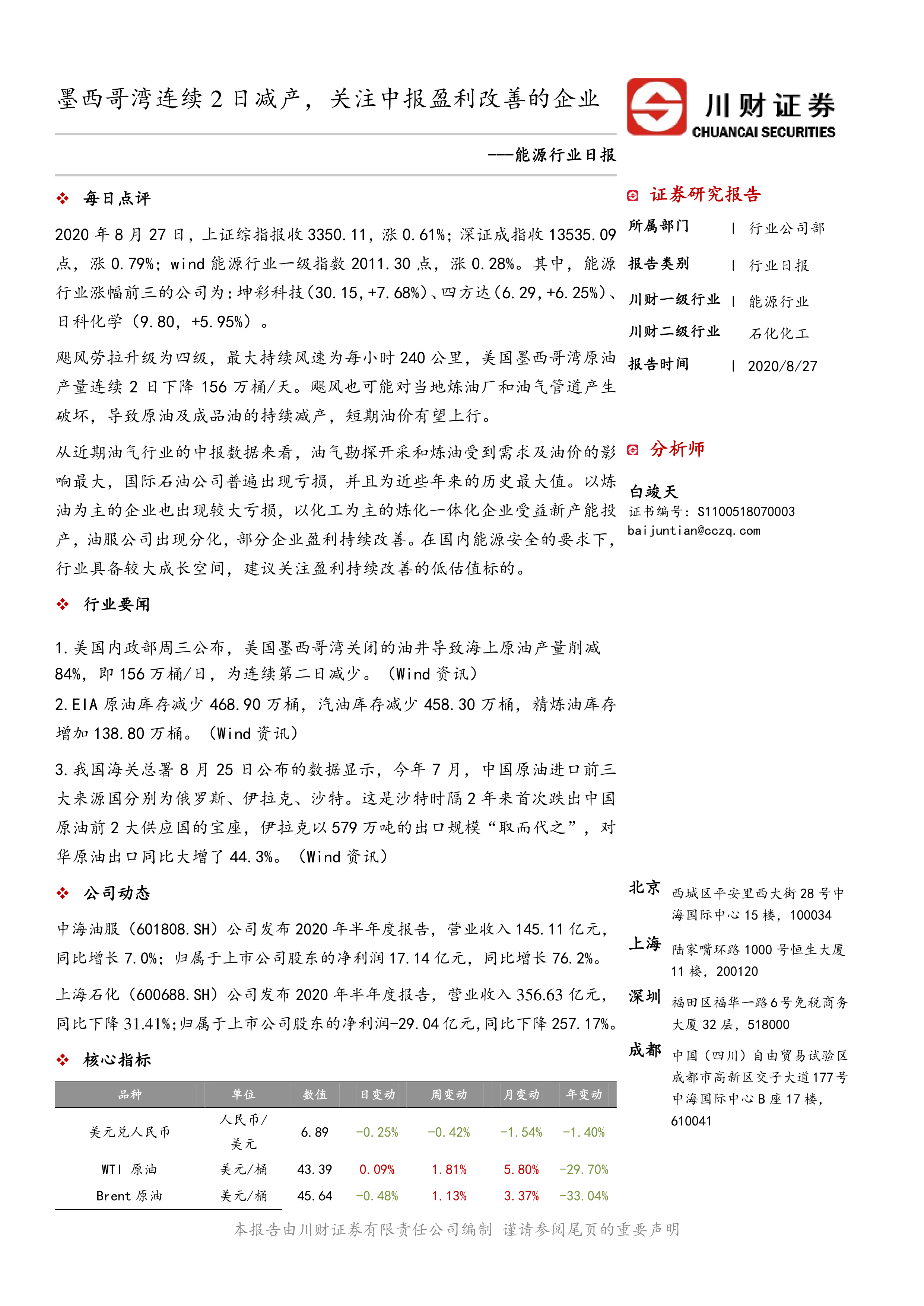 报告首先概述了8月27日能源行业市场表现,上证综指、深证成指及Wind能源行业一级指数均小幅上涨。报告指出,飓风劳拉升级为四级飓风,导致墨西哥湾原油产量连续两天大幅下降,短期内油价有望上涨。 同时,报告提供了EIA原油库存、汽油库存和精炼油库存数据,以及中国7月原油进口来源国数据,显示沙特原油出口规模下降,伊拉克取代沙特成为中国原油进口第二大来源国。