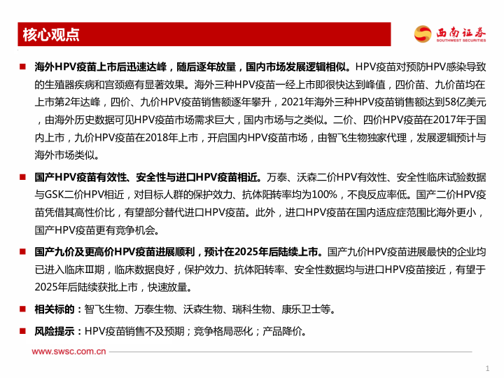 本报告的核心观点是:HPV疫苗市场潜力巨大,国内市场发展逻辑与海外相似,国产疫苗凭借性价比优势和技术进步,有望快速发展,并逐步替代进口疫苗。