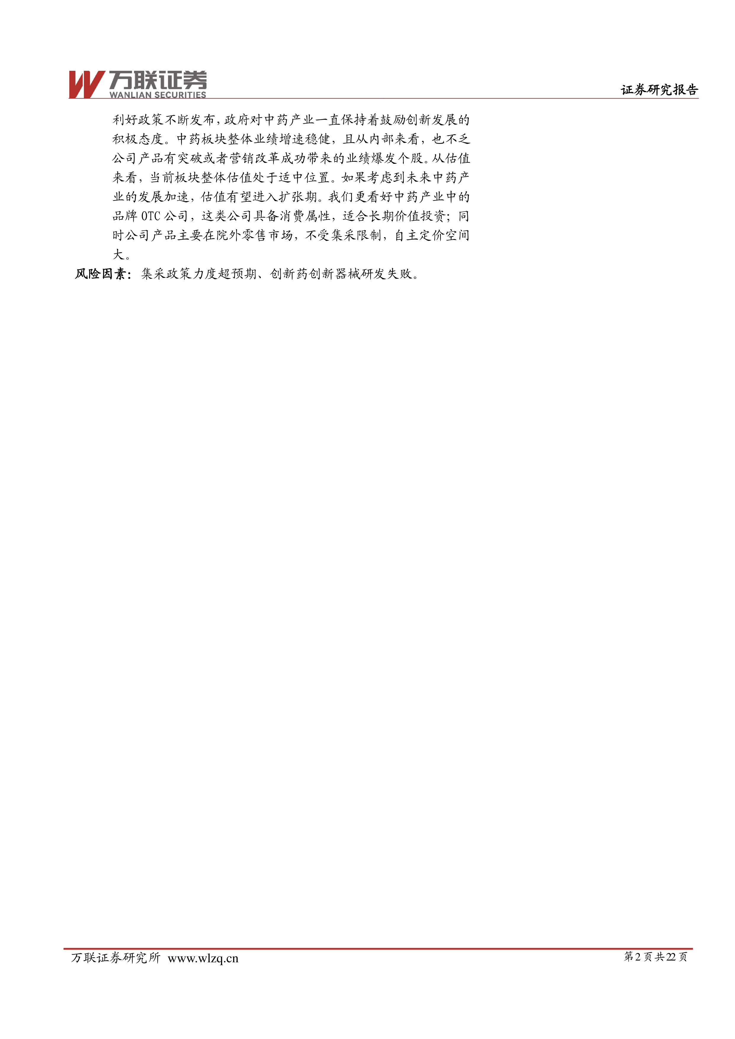 中药:政策呵护、业绩稳健、估值合理。近年来针对中药产业的利好政策不断发布,政府对中药产业一直保持着鼓励创新发展的积极态度。中药板块整体业绩增速稳健,且从内部来看,也不乏公司产品有突破或者营销改革成功带来的业绩爆发个股。从估值来看,当前板块整体估值处于适中位置。如果考虑到未来中药产业的发展加速,估值有望进入扩张期。我们更看好中药产业中的品牌OTC公司,这类公司具备消费属性,适合长期价值投资;同时公司产品主要在院外零售市场,不受集采限制,自主定价空间大。