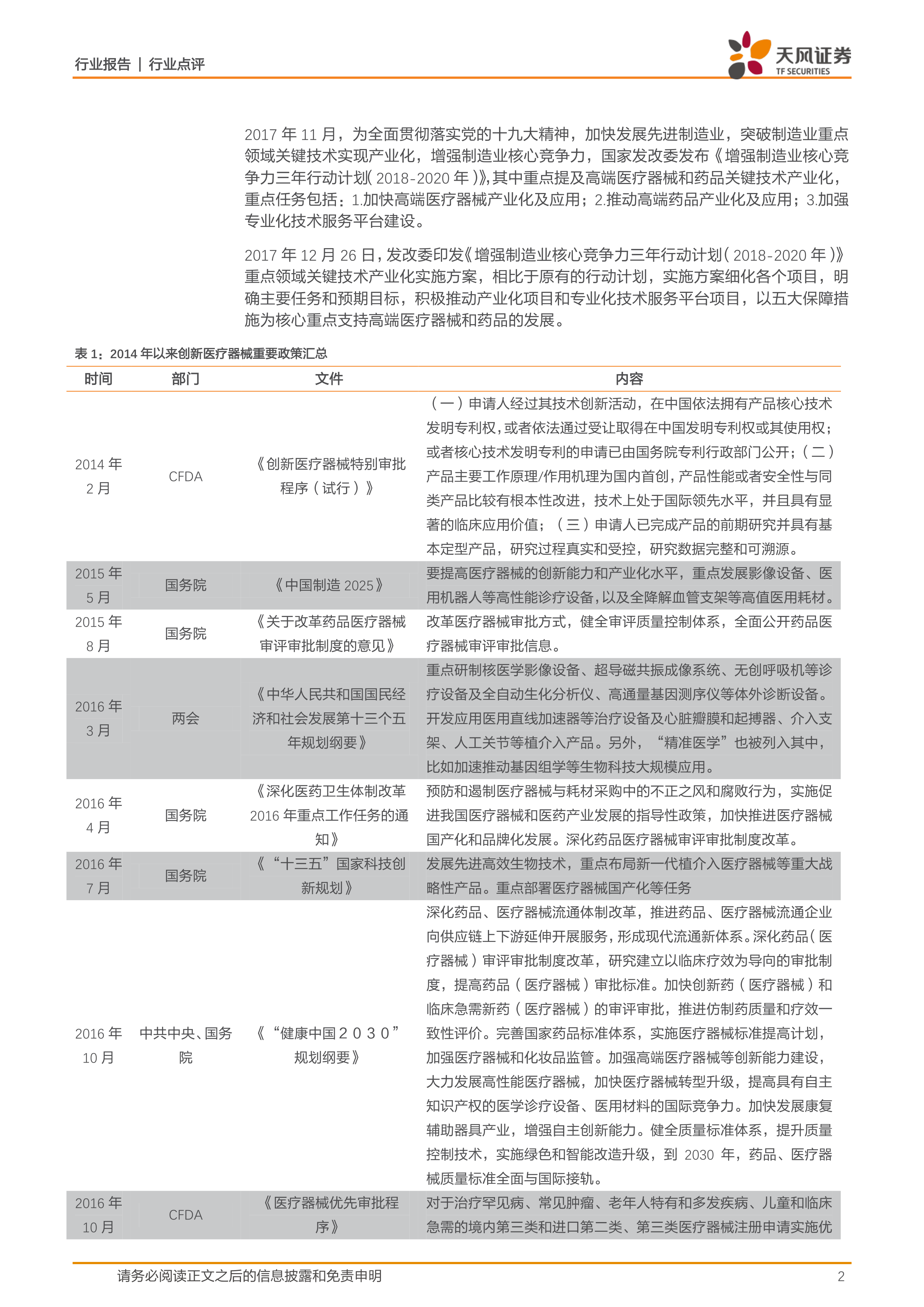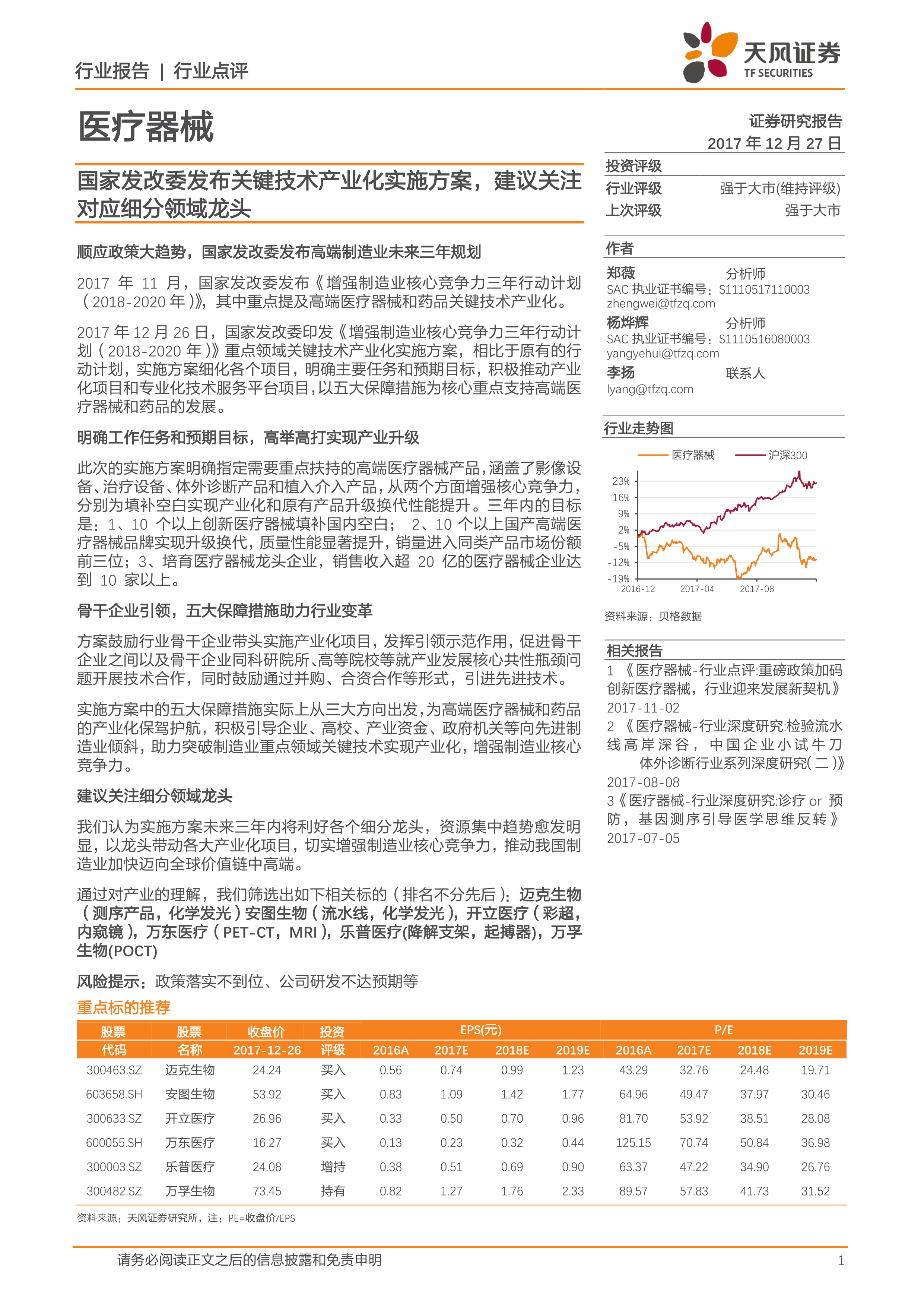 本报告的核心观点是:国家发改委发布的《增强制造业核心竞争力三年行动计划(2018-2020年)》及其配套的《高端医疗器械和药品关键技术产业化实施方案》,为中国高端医疗器械行业带来了重大的发展机遇。该方案明确了未来三年内高端医疗器械产业发展的重点方向、目标和支持措施,将推动行业升级换代,并利好细分领域的龙头企业。