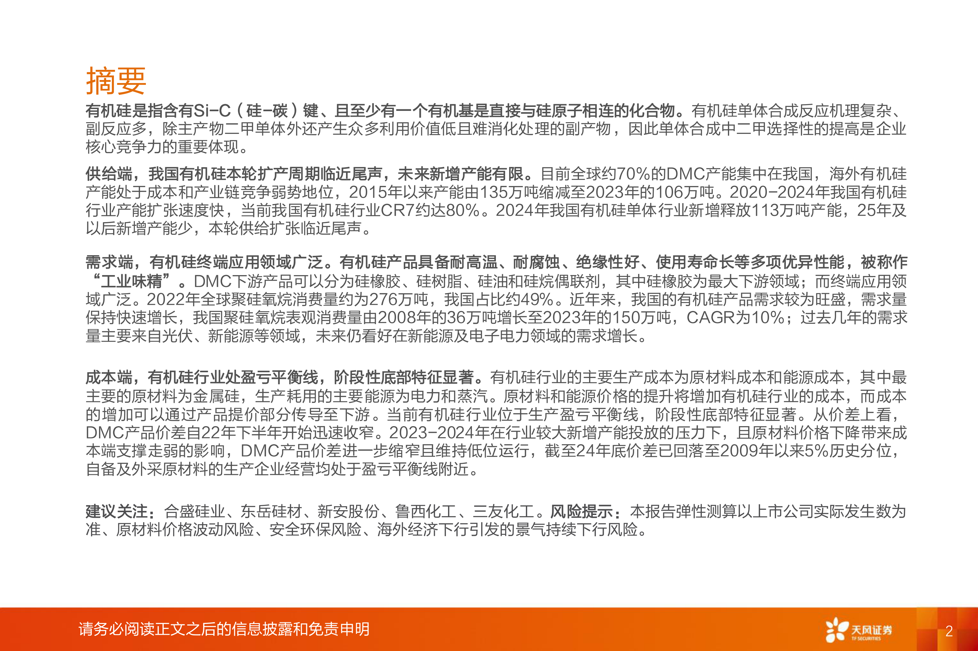 建议关注:合盛硅业、东岳硅材、新安股份、鲁西化工、三友化工。风险提示:本报告弹性测算以上市公司实际发生数为准、原材料价格波动风险、安全环保风险、海外经济下行引发的景气持续下行风险。
