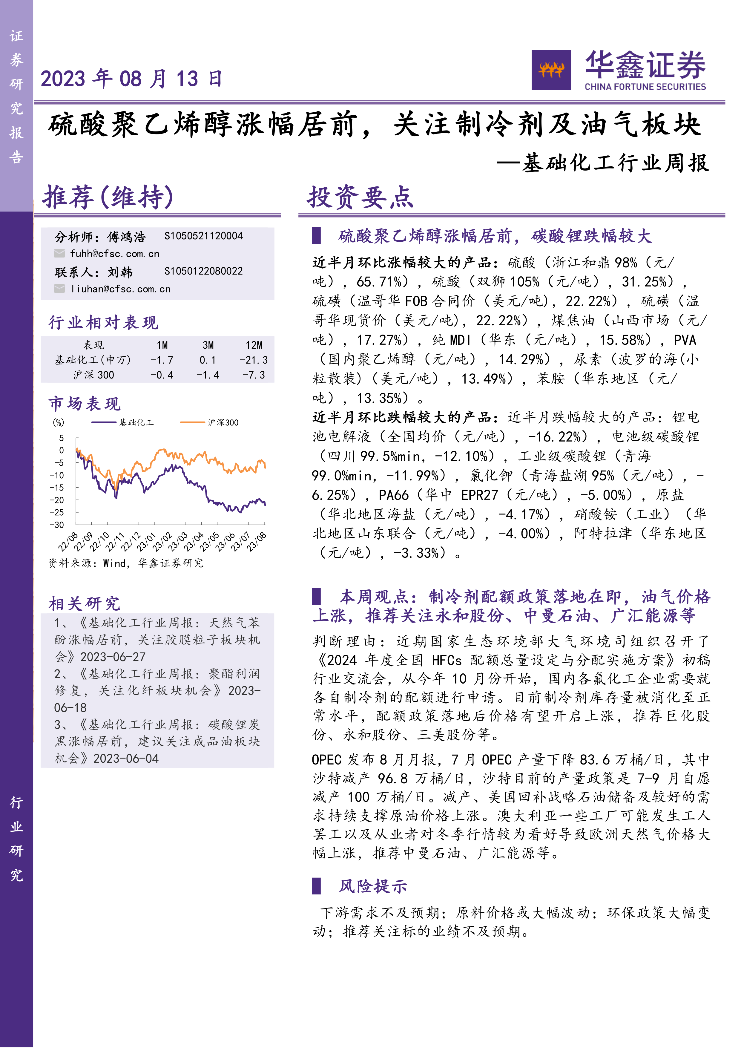 基础化工行业周报:硫酸聚乙烯醇涨幅居前,关注制冷剂及油气板块