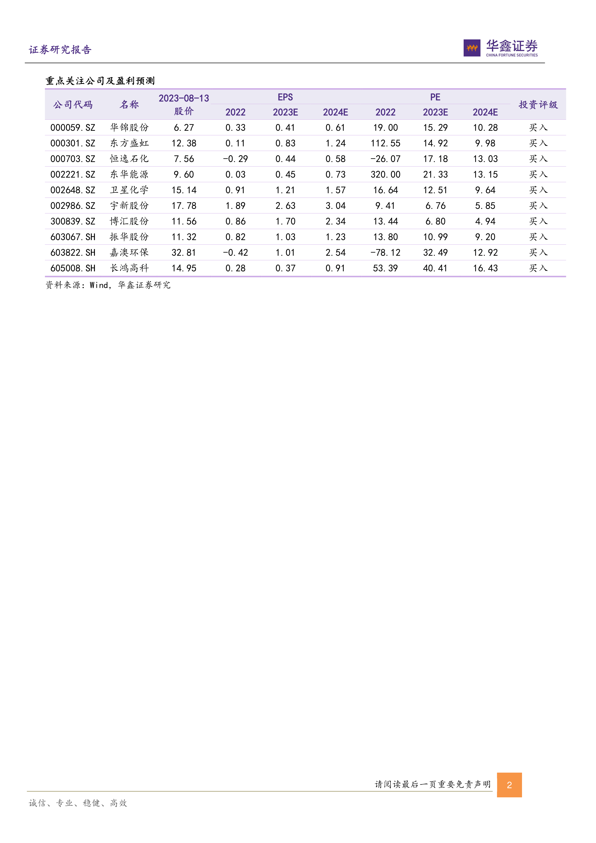 本节对华鑫证券重点关注的化工公司进行了逐一分析,包括嘉澳环保、东方盛虹、卫星化学、东华能源、博汇股份和长鸿高科。 分析内容涵盖了每家公司的投资亮点、近期动态、以及盈利预测,并结合行业大环境对公司未来发展前景进行了展望。 分析中充分利用了财务数据和行业信息,并对公司面临的风险进行了评估。