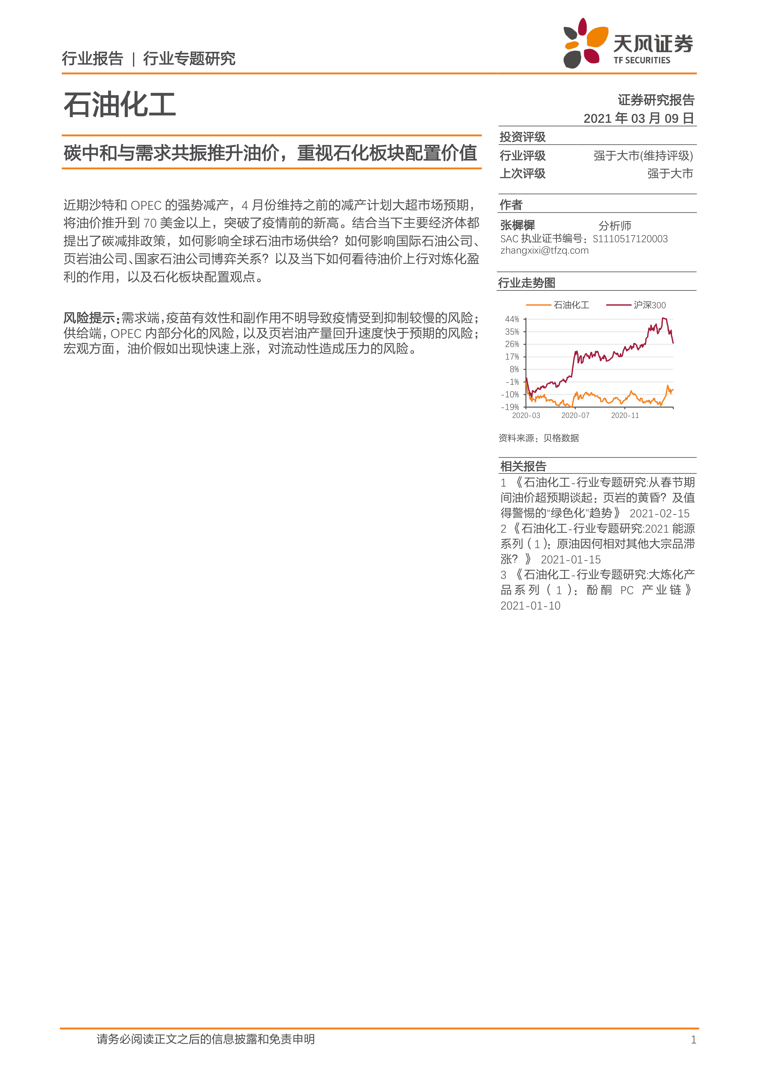 近期沙特和 OPEC 的强势减产, 4 月份维持之前的减产计划大超市场预期,将油价推升到 70 美金以上,突破了疫情前的新高。结合当下主要经济体都提出了碳减排政策,如何影响全球石油市场供给?如何影响国际石油公司、页岩油公司、国家石油公司博弈关系?以及当下如何看待油价上行对炼化盈利的作用,以及石化板块配置观点。