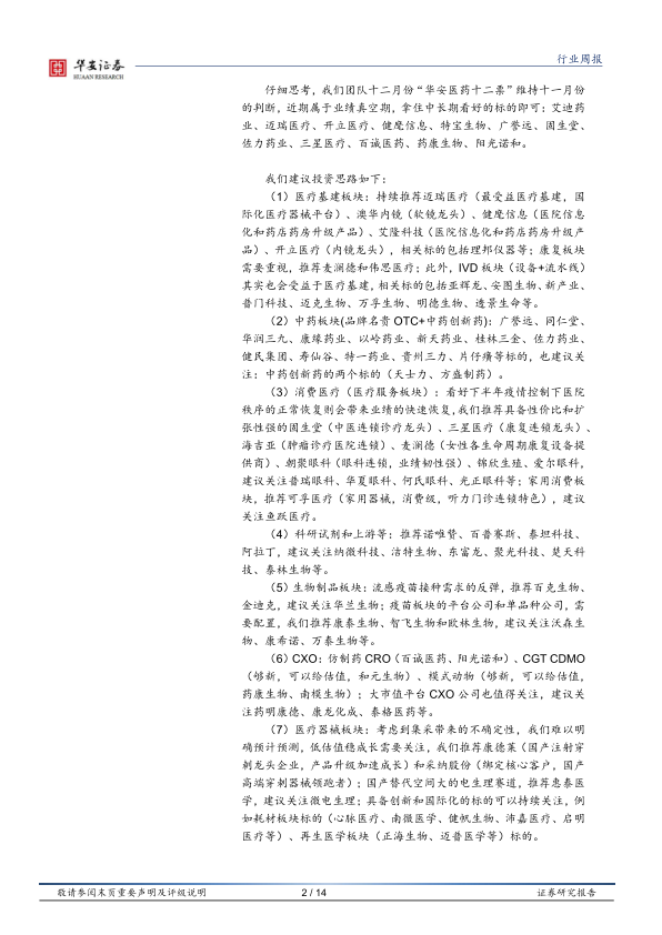 我们策略报告建议今年全年的方向配置:医疗设备(医疗基建)+中药(政策友好+低估值)+医疗消费(医疗服务+消费医疗产品)+创新药及产业链(新增)+其他方向自下而上寻找标的,此外,高值耗材和发光赛道,也是我们新纳入的建议重点关注的方向。