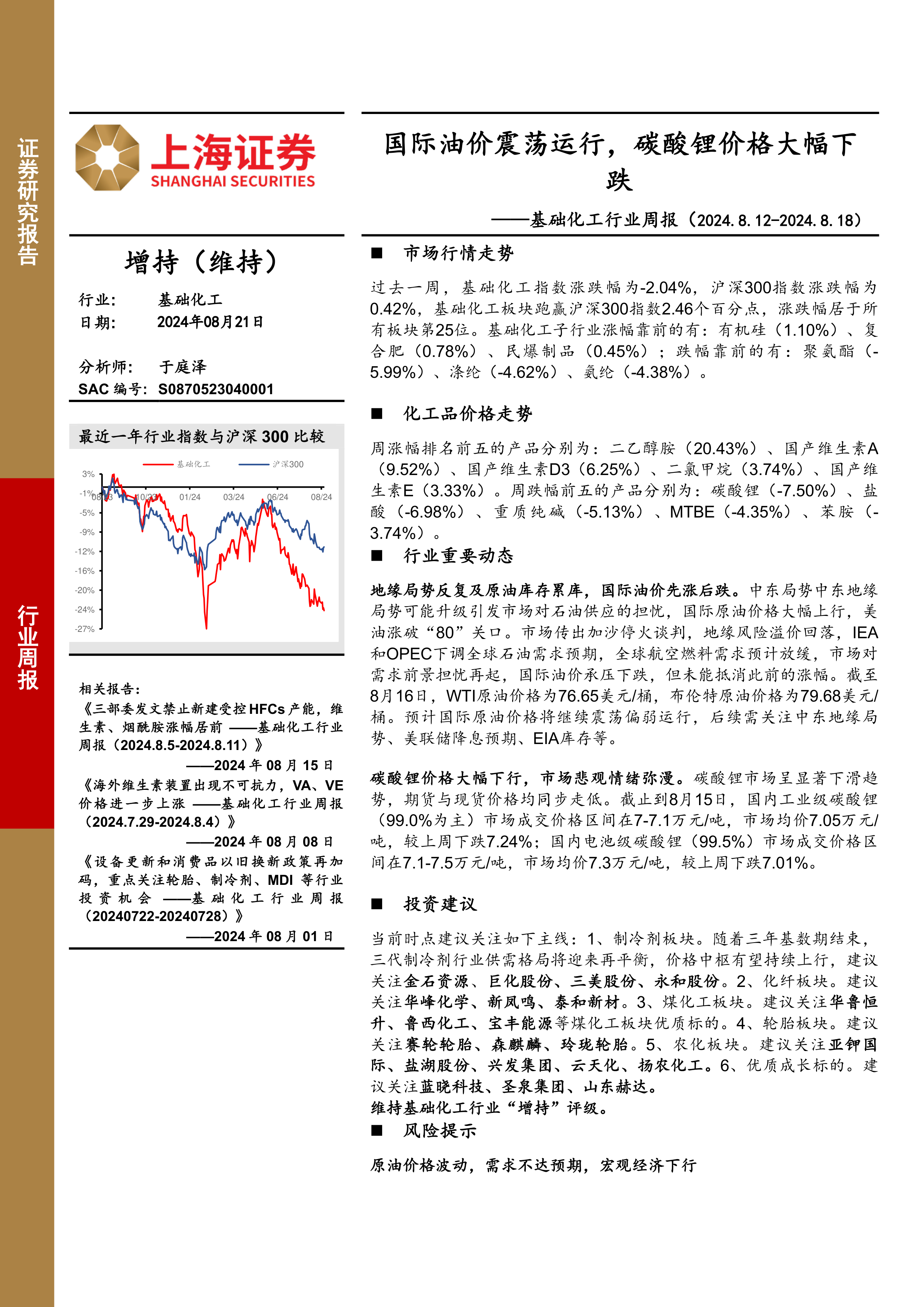 本周基础化工行业整体表现偏弱,碳酸锂价格大幅下跌是主要负面因素,国际油价震荡也带来一定影响。个股涨跌分化明显,部分公司业绩表现亮眼,部分公司则面临挑战。报告建议投资者关注行业发展趋势,谨慎投资,并密切关注宏观经济环境和市场风险。 报告中对重点个股的分析以及对未来投资方向的建议,为投资者提供了有价值的参考信息。 然而,投资者仍需结合自身情况进行独立判断,切勿盲目跟风。