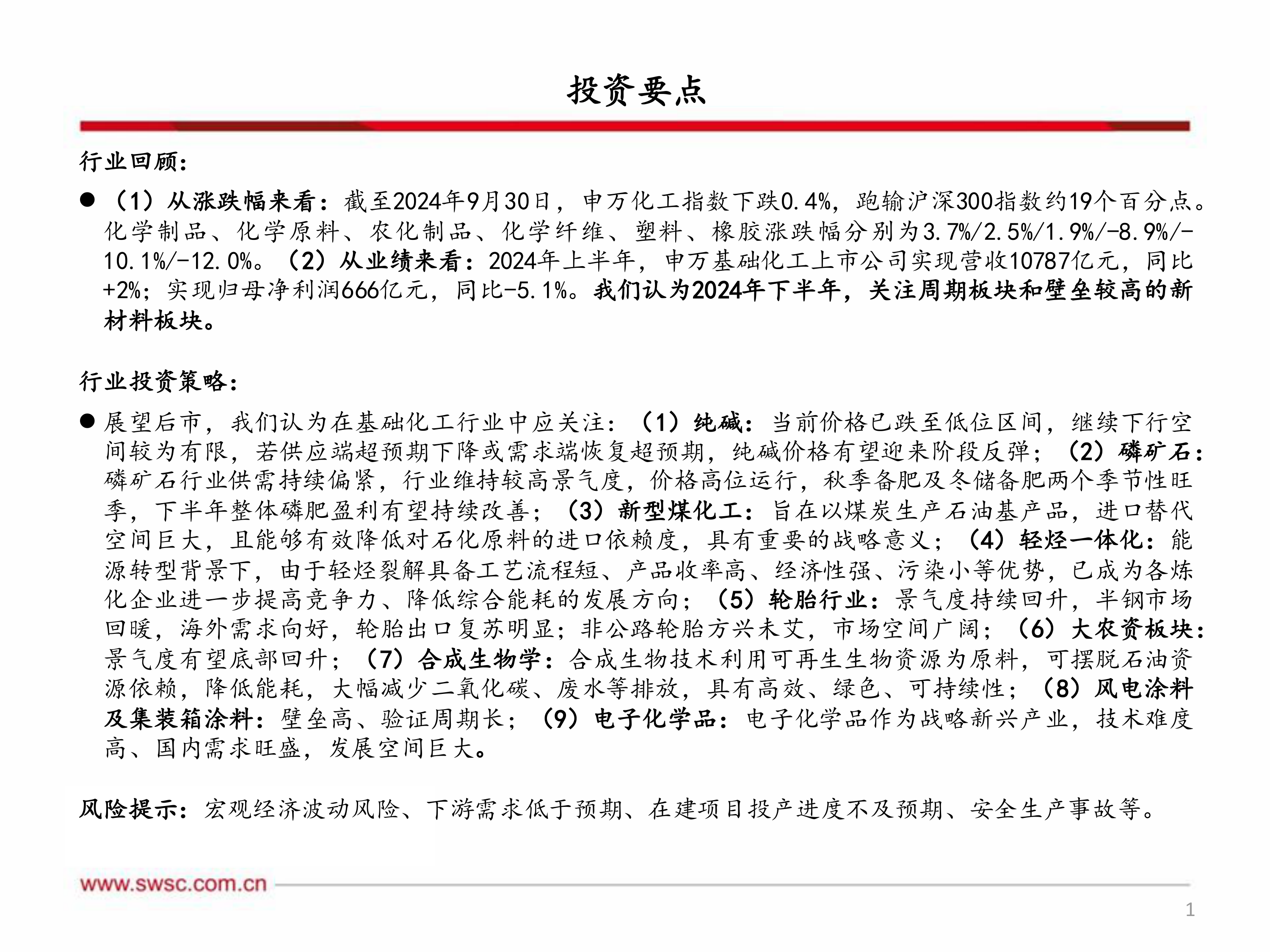 本报告基于2024年前三季度的数据,对化工行业进行了全面的分析,指出部分细分领域具备较强的投资价值,例如纯碱、磷矿石、新型煤化工、轻烃一体化、轮胎、合成生物学以及部分电子化学品等。 报告同时强调了宏观经济波动、下游需求低于预期等风险因素。 投资者应根据自身风险承受能力和投资目标,谨慎决策。 报告中提供的投资建议仅供参考,不构成投资建议。
