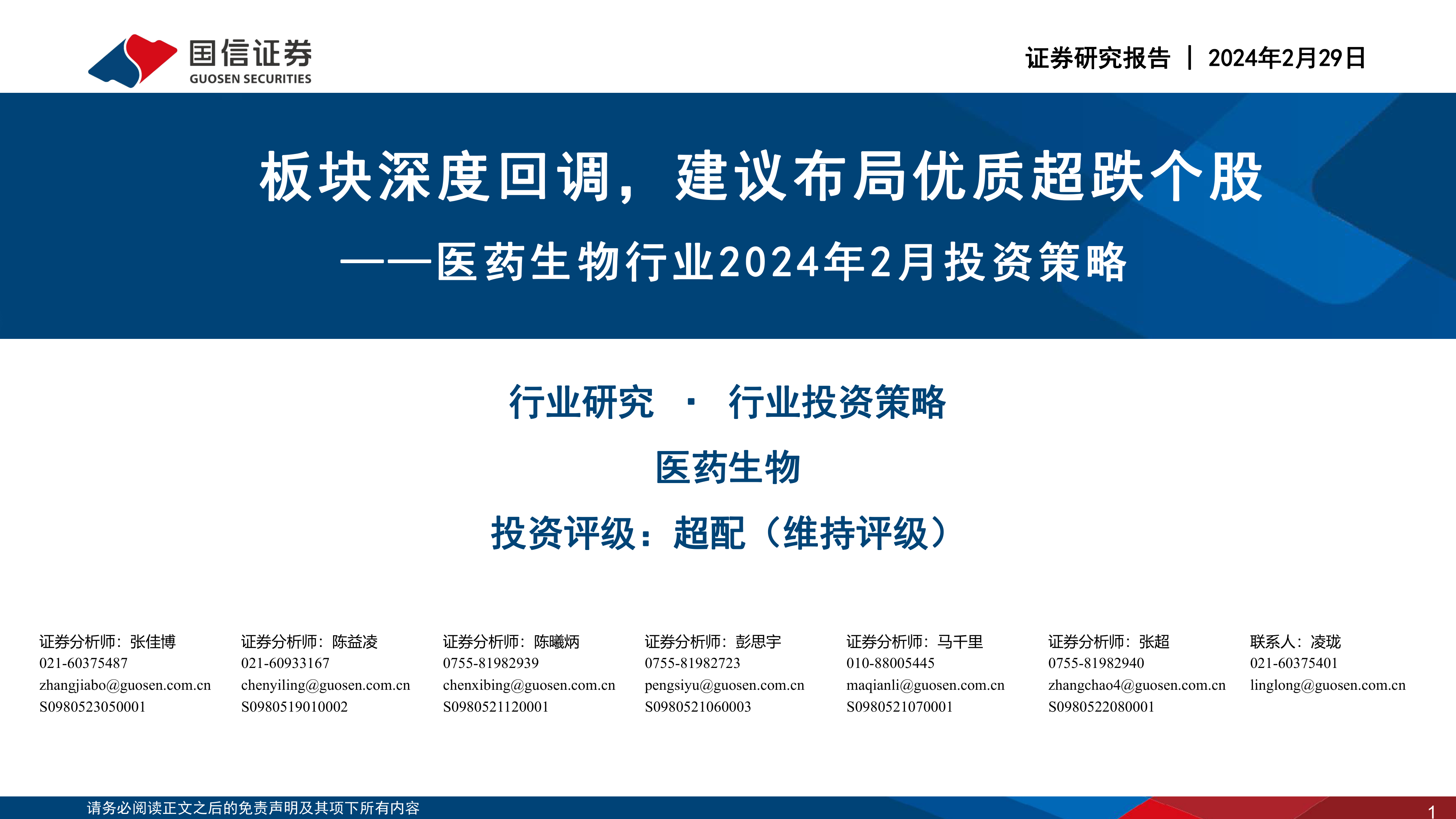 医药生物行业2024年2月投资策略:板块深度回调,建议布局优质超跌个股