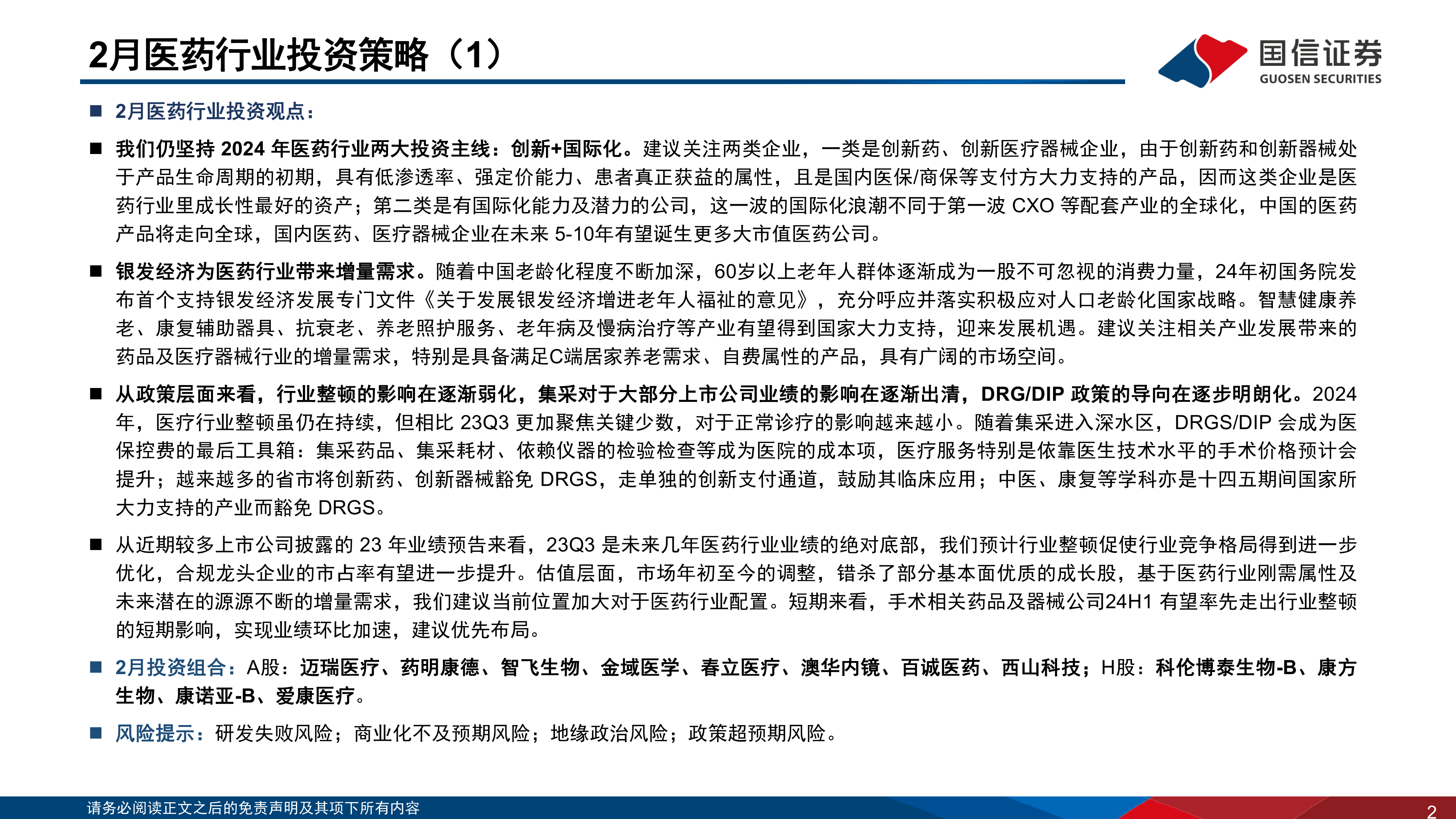 本报告的核心观点是:2024年2月医药生物行业板块深度回调,但基于行业刚需属性及未来潜在的增量需求,建议投资者加大配置优质超跌个股。报告主要从宏观经济数据、政策环境、细分板块表现以及投资组合策略四个方面进行分析,并推荐了具体的投资组合。
