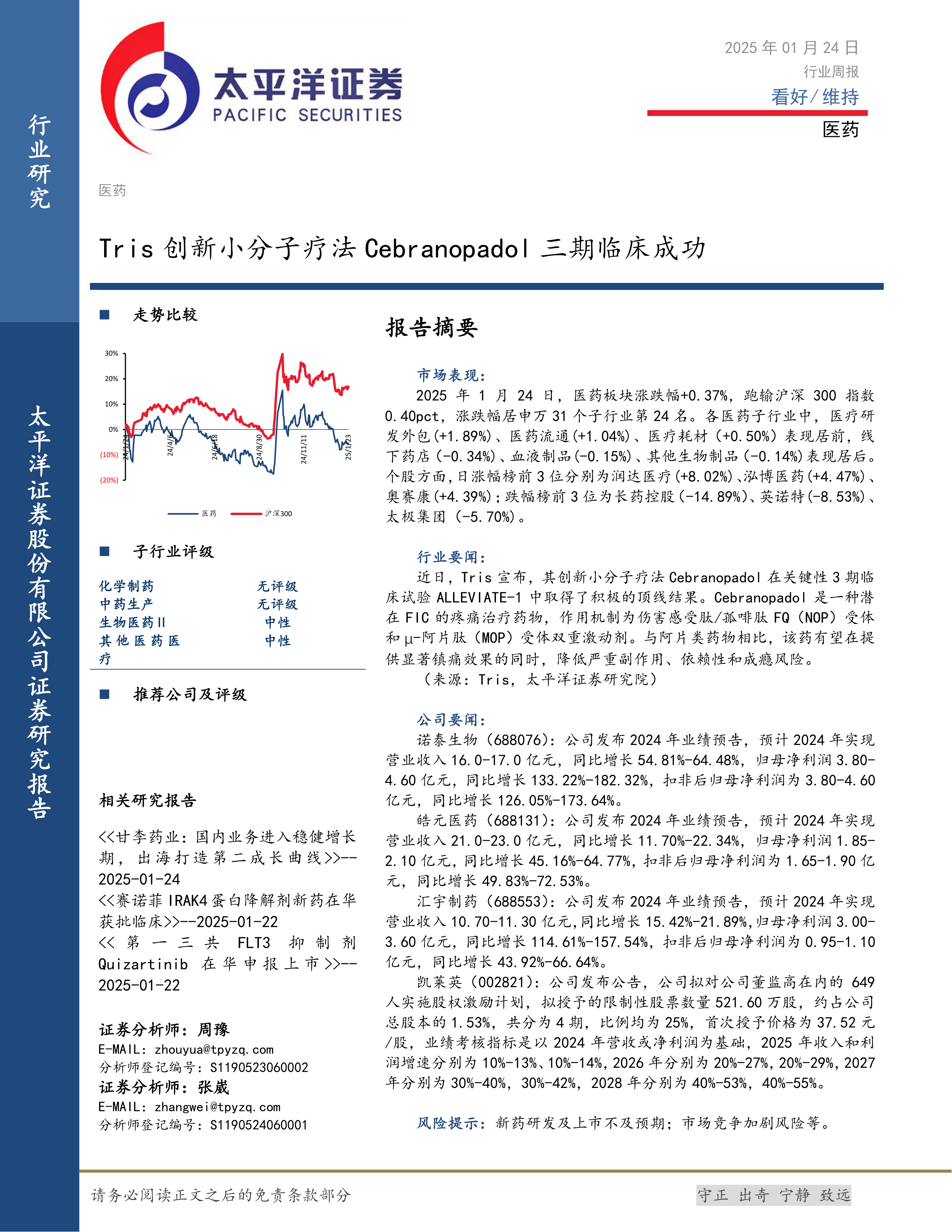行业要闻主要关注Tris公司Cebranopadol三期临床试验成功的消息,这被认为是医药行业的重要利好。公司要闻则重点介绍了诺泰生物、皓元医药、汇宇制药和凯莱英的业绩预告和股权激励计划,这些信息反映了部分医药公司的经营状况和未来发展规划。