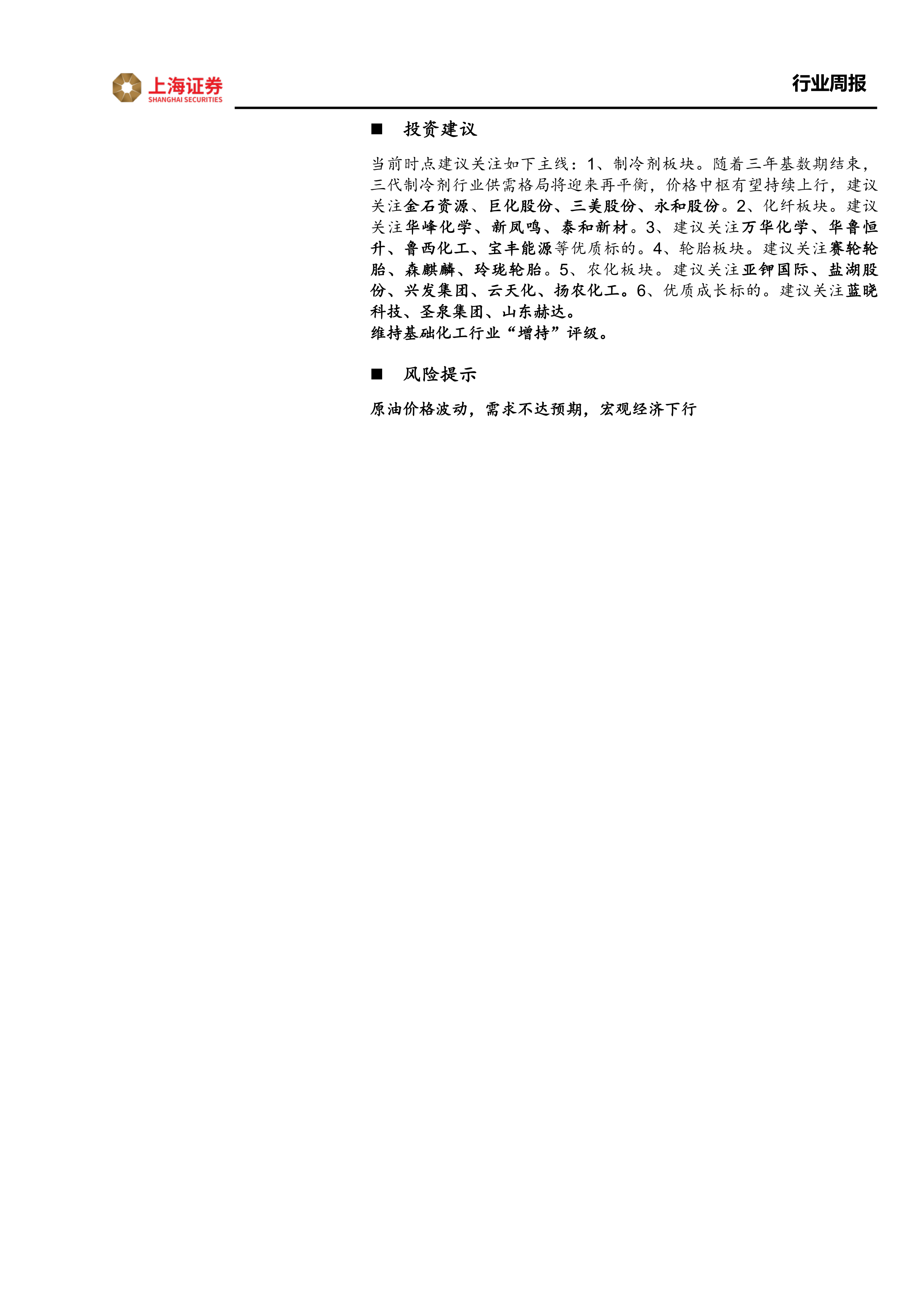 报告建议关注以下投资主线:制冷剂板块(金石资源、巨化股份等)、化纤板块(华峰化学、新凤鸣等)、优质标的(万华化学、华鲁恒升等)、轮胎板块(赛轮轮胎、森麒麟等)、农化板块(亚钾国际、盐湖股份等)以及优质成长标的(蓝晓科技、圣泉集团等)。维持基础化工行业“增持”评级。