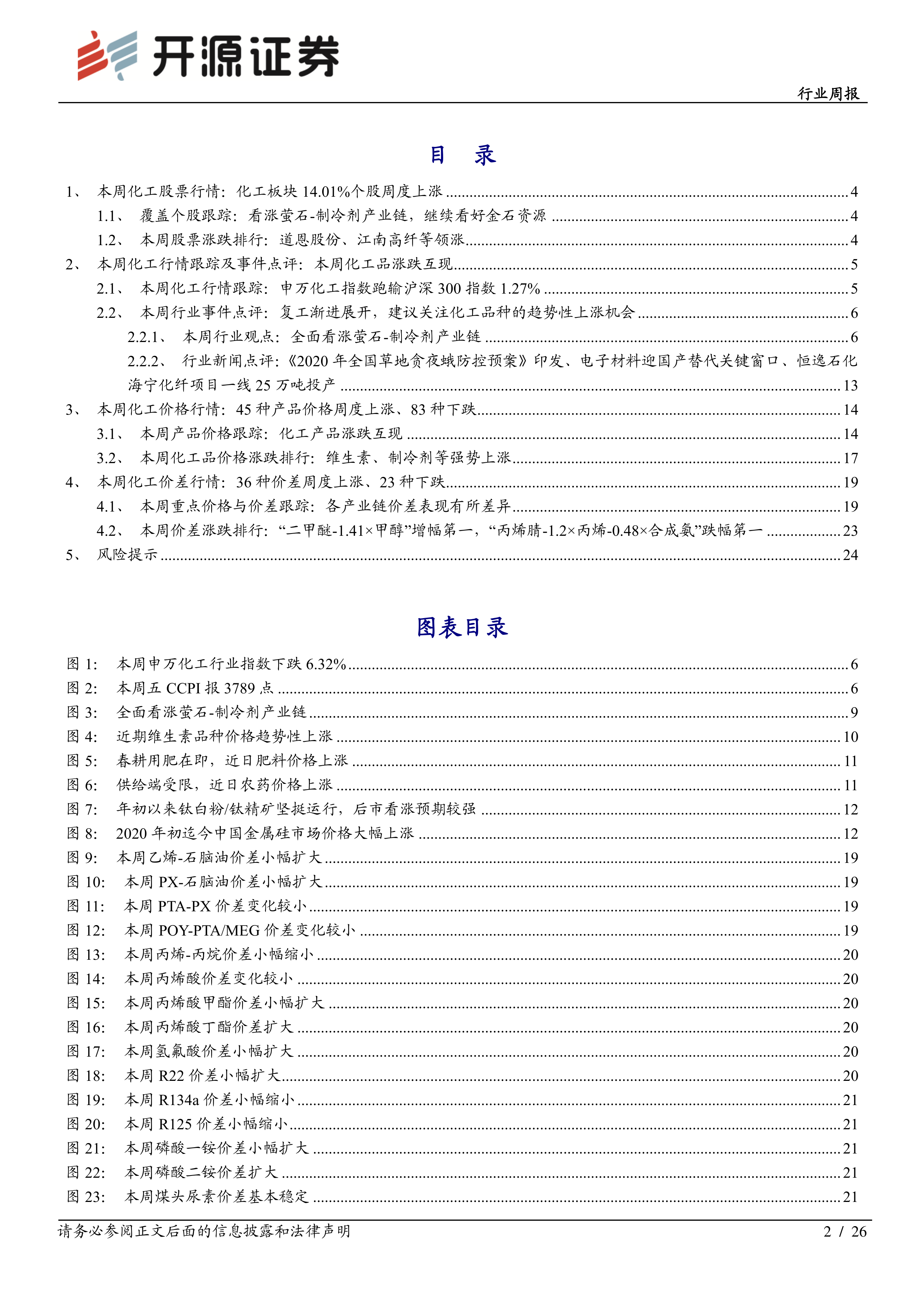 本报告基于对近期化工市场行情的跟踪和分析,认为由于新冠肺炎疫情的影响,萤石-制冷剂产业链供需失衡,价格上涨。报告看好萤石、氟化铝、氢氟酸和制冷剂等品种的未来价格走势,并推荐了相应的受益标的。同时,报告也分析了维生素、化肥、农药、钛白粉和金属硅等化工品种的市场行情,并提示了潜在的风险因素。 投资者需谨慎参考,并结合自身情况进行投资决策。 报告中所列数据和分析仅供参考,不构成投资建议。