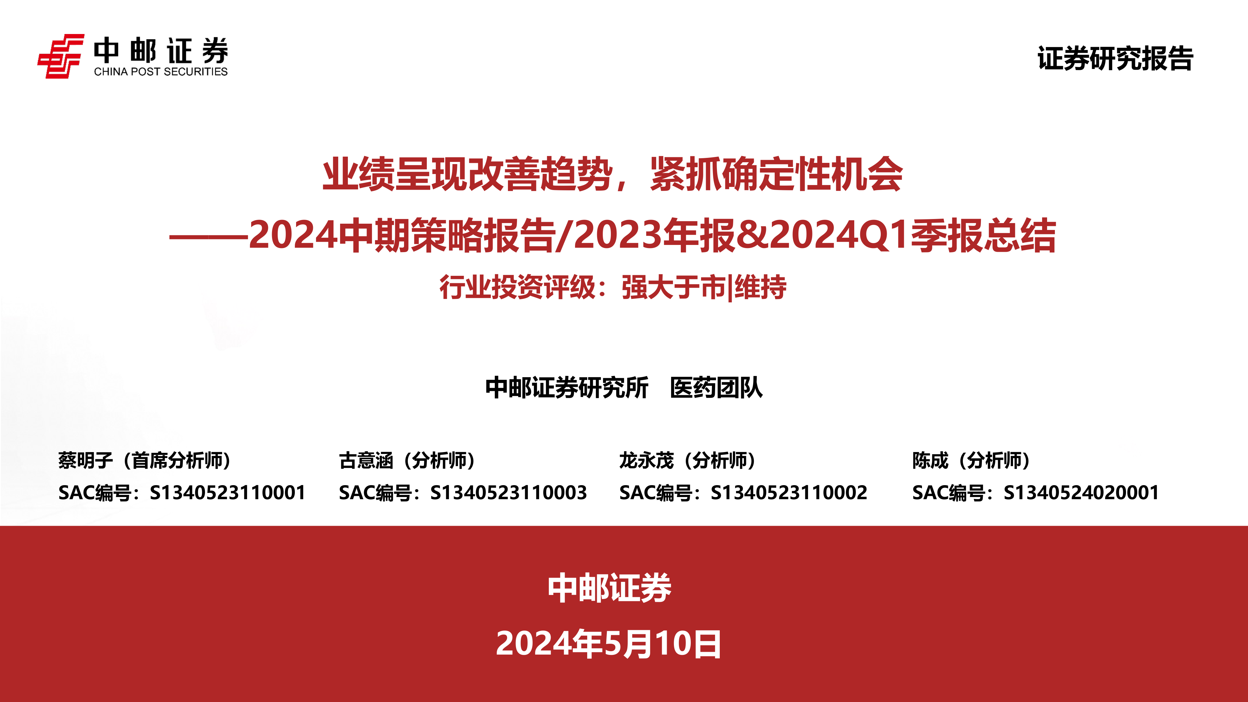 医药2024中期策略报告/2023年报&2024Q1季报总结:业绩呈现改善趋势,紧抓确定性机会