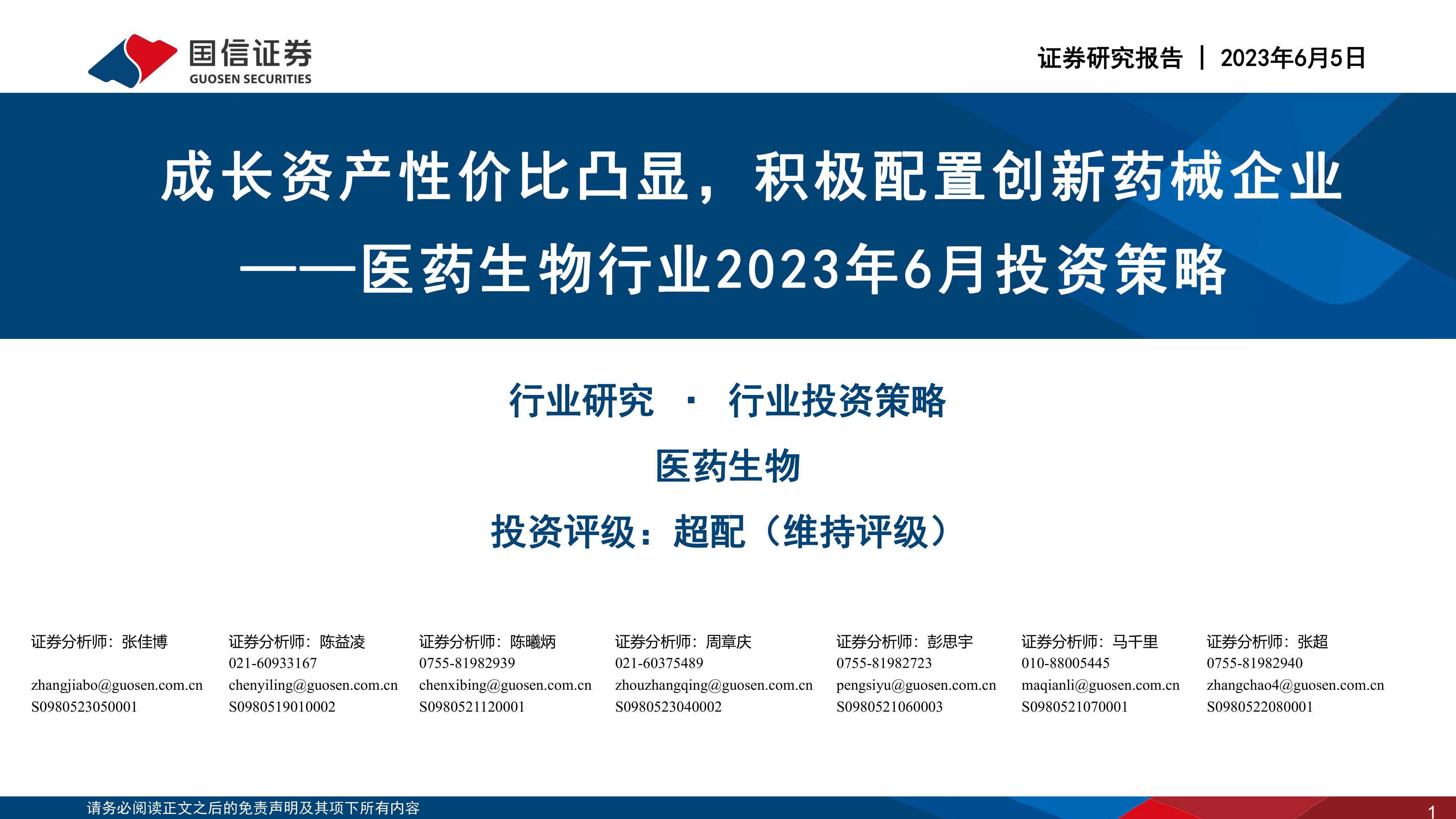 医药生物行业2023年6月投资策略:成长资产性价比凸显,积极配置创新药械企业