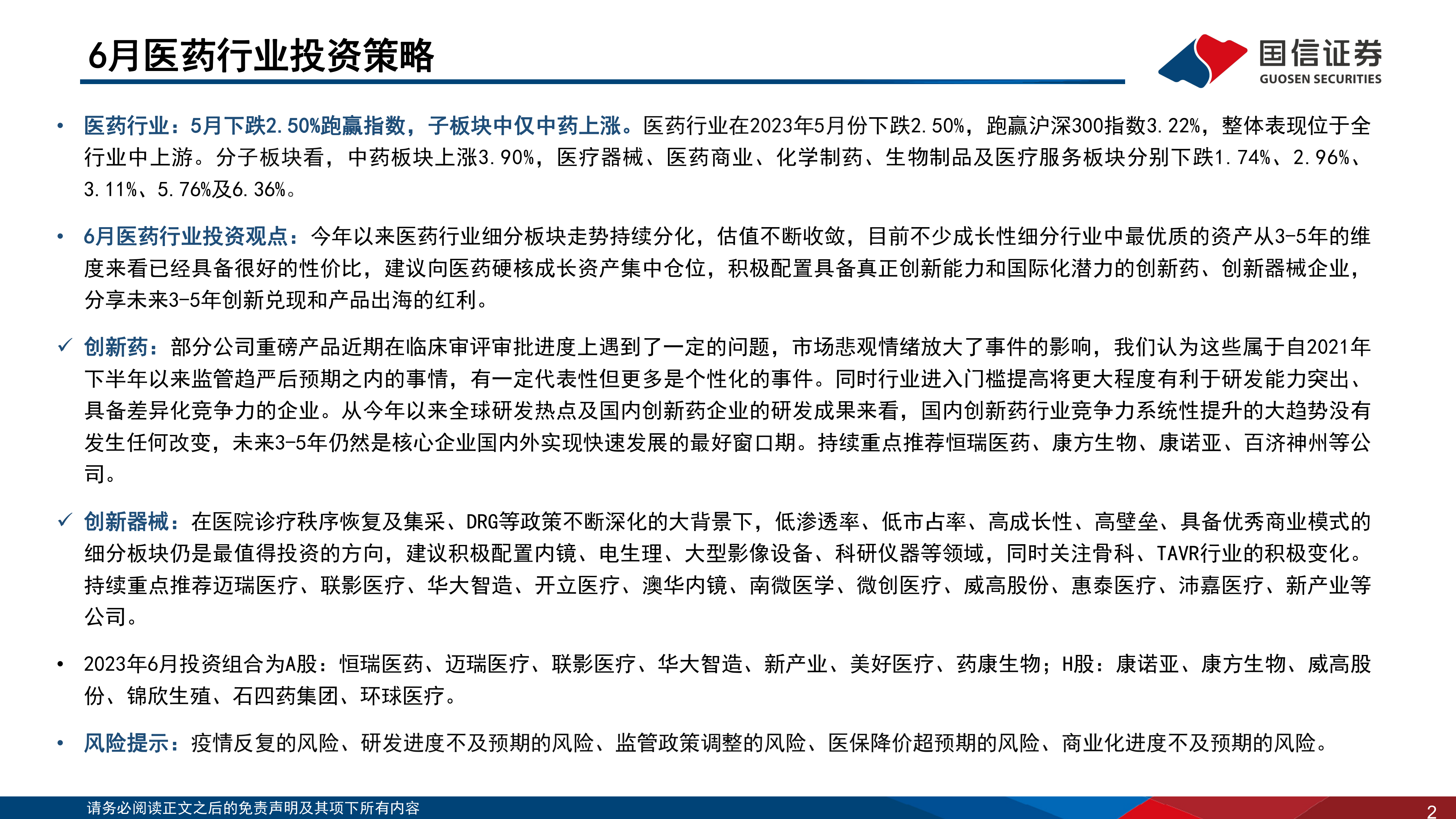 本报告基于公开数据和信息,对2023年6月医药行业进行了全面分析,指出行业细分板块走势分化,但估值已处于历史低位,部分成长性细分行业优质资产性价比凸显。报告建议投资者积极配置创新药和创新器械企业,分享未来创新兑现和产品出海的红利。报告还对多个细分板块的重点公司进行了分析和推荐,并对近期医药行业重大学术会议和集采政策进行了点评。 投资者需注意报告中提到的风险提示,并根据自身情况进行投资决策。