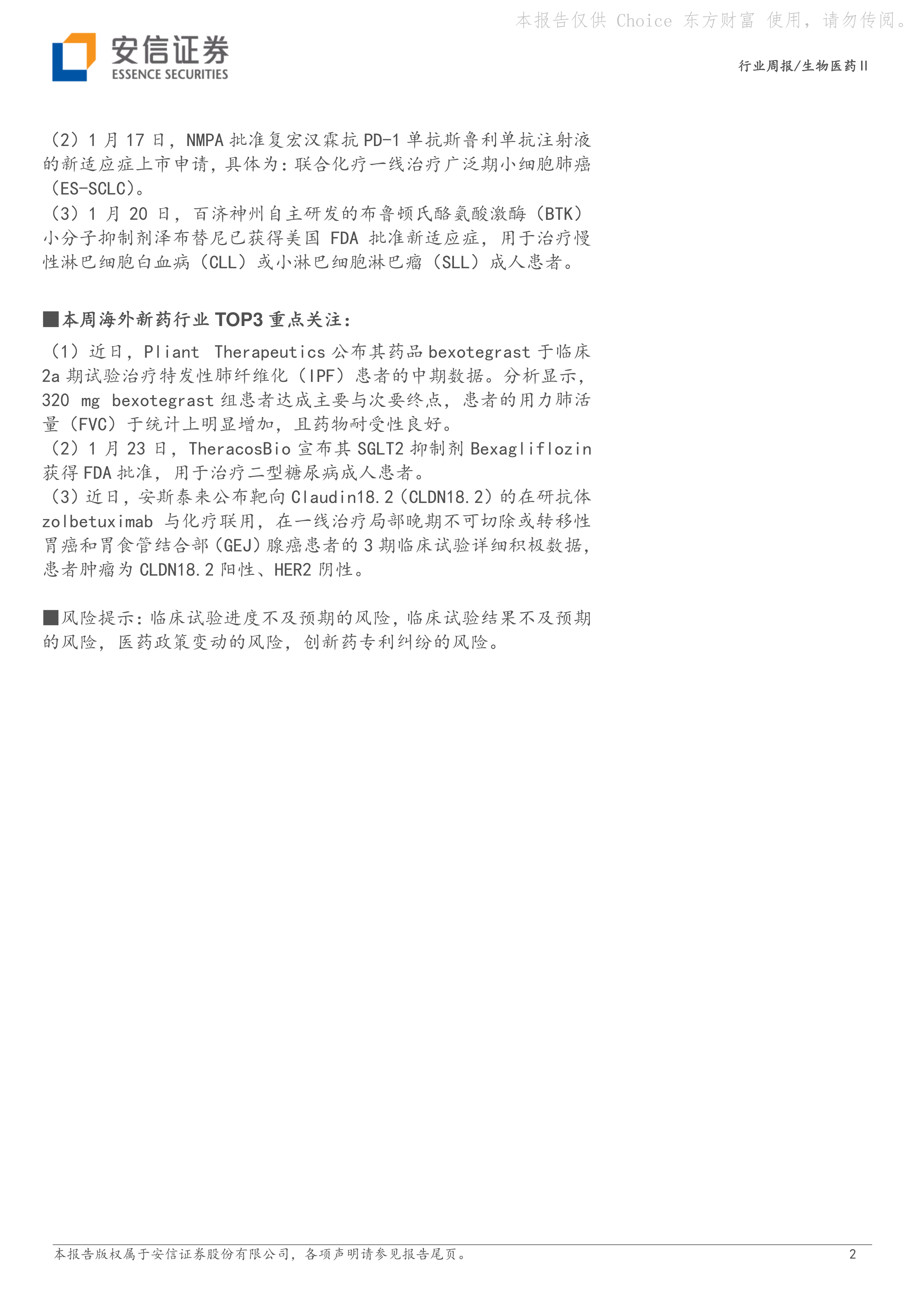 报告最后列出了投资生物医药行业的潜在风险,包括临床试验进度不及预期、临床试验结果不及预期、医药政策变动以及创新药专利纠纷等。