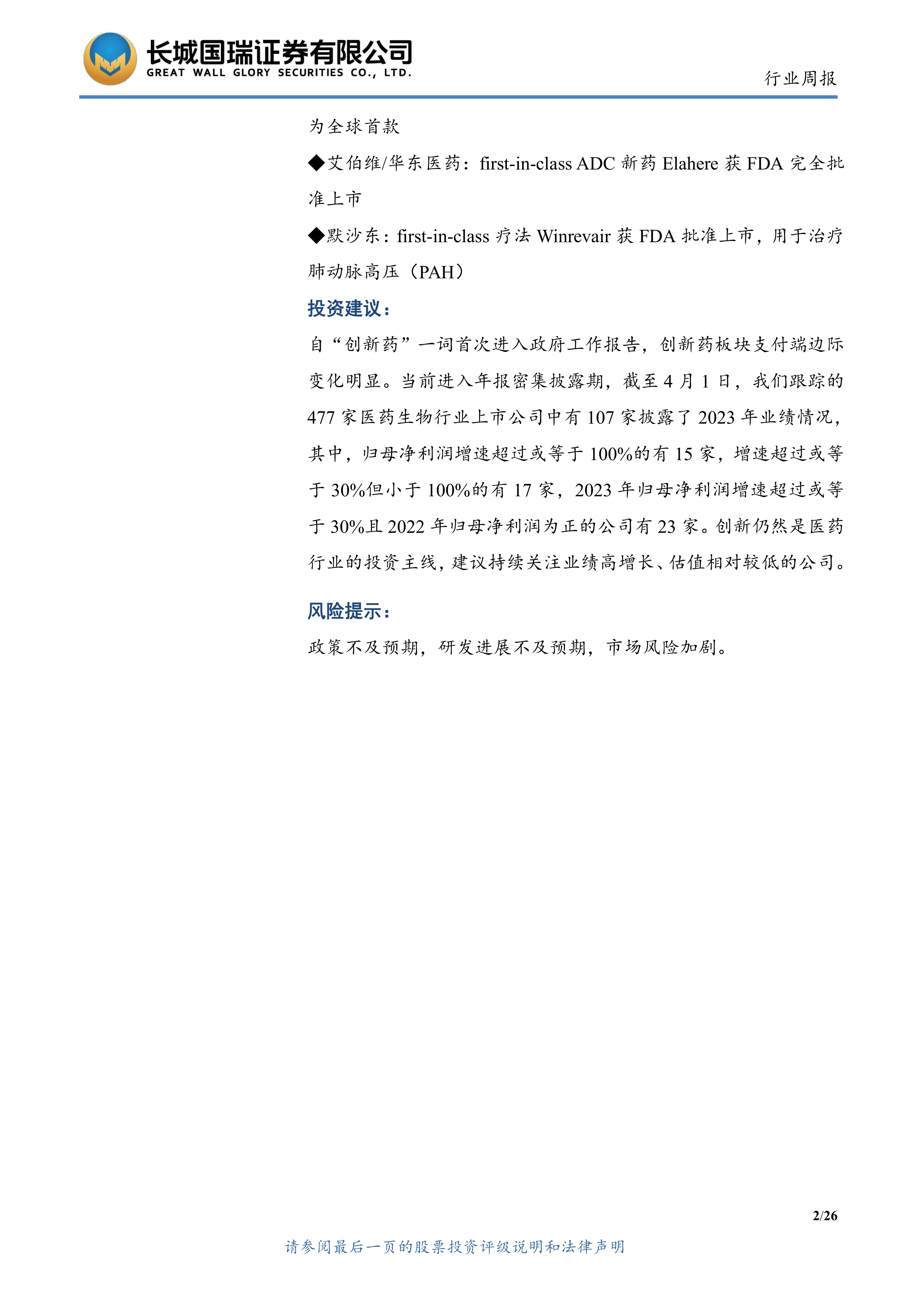 自“创新药”一词首次进入政府工作报告,创新药板块支付端边际变化明显。当前进入年报密集披露期,截至4月1日,我们跟踪的477家医药生物行业上市公司中有107家披露了2023年业绩情况,其中,归母净利润增速超过或等于100%的有15家,增速超过或等于30%但小于100%的有17家,2023年归母净利润增速超过或等于30%且2022年归母净利润为正的公司有23家。创新仍然是医药行业的投资主线,建议持续关注业绩高增长、估值相对较低的公司。