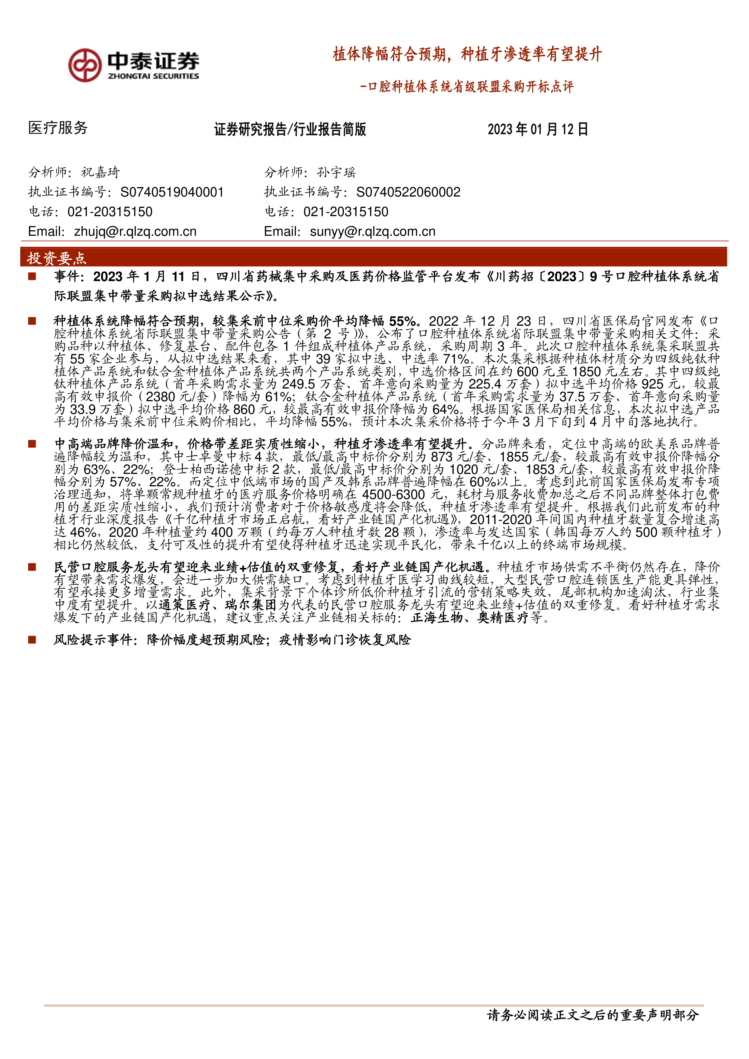 事件:2023年1月11日,四川省药械集中采购及医药价格监管平台发布《川药招【2023】9号口腔种植体系统省际联盟集中带量采购拟中选结果公示》。