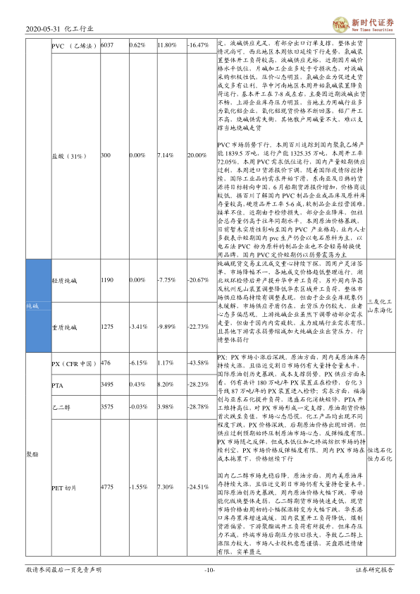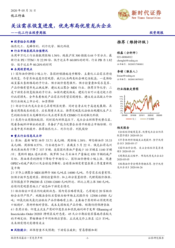 本报告对2020年5月31日化工行业市场进行了全面分析,指出化工行业需求正在恢复,但恢复速度存在不确定性。报告建议关注供给端寡头垄断和下游需求恢复较快的子行业,并长期关注具备逆周期增长能力的行业龙头企业,特别是农药行业龙头企业。报告还详细分析了多个化工产品的价格走势和市场动态,并提供了相应的投资建议,但同时也提示了行业投资的潜在风险。 报告数据主要来源于Wind和新时代证券研究所,以及百川资讯、隆众石化、饲料行业信息网、生意社等机构。 投资者需谨慎参考,并结合自身情况进行独立判断。