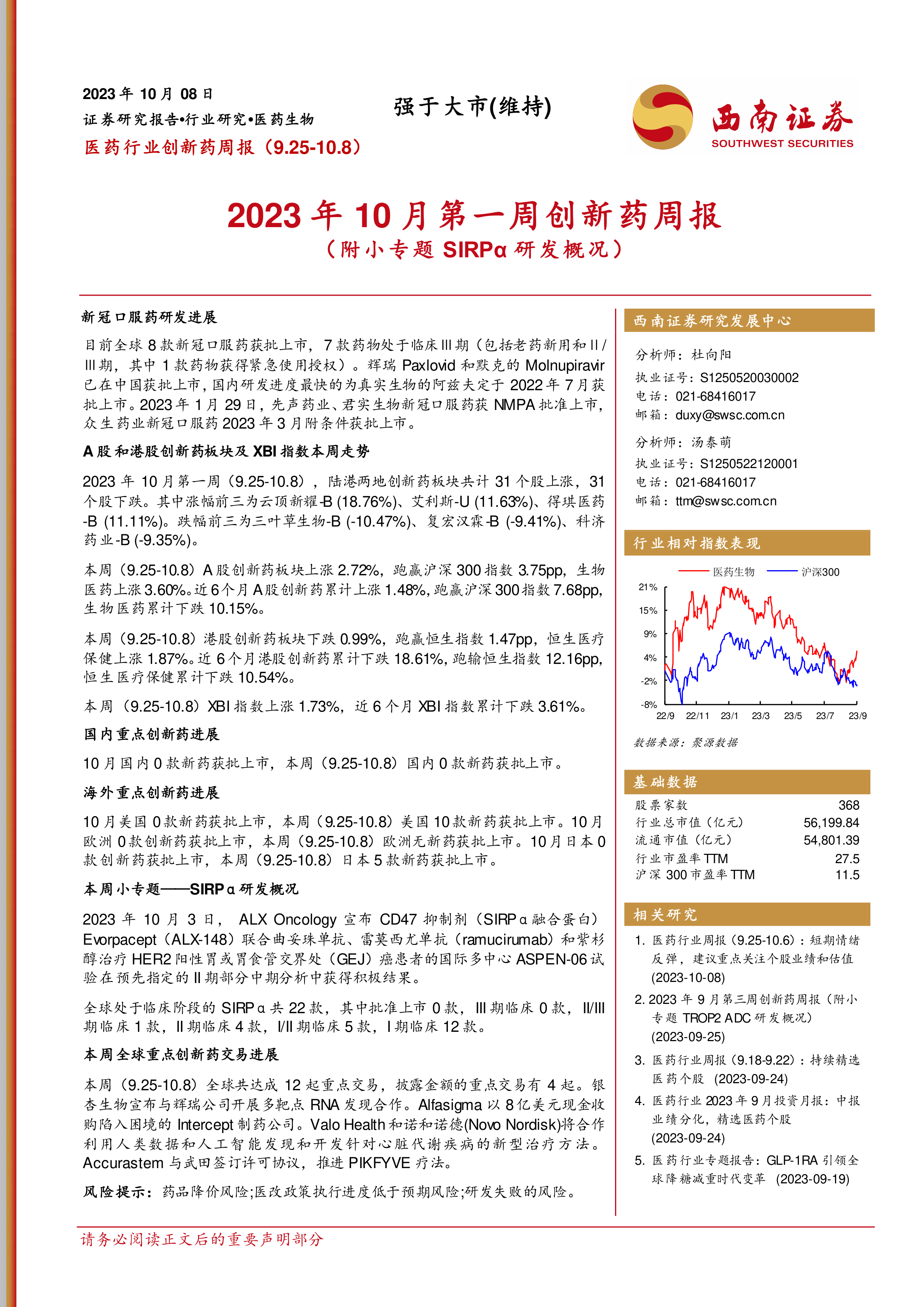 医药行业创新药周报:2023年10月第一周创新药周报(附小专题SIRPα研发概况)