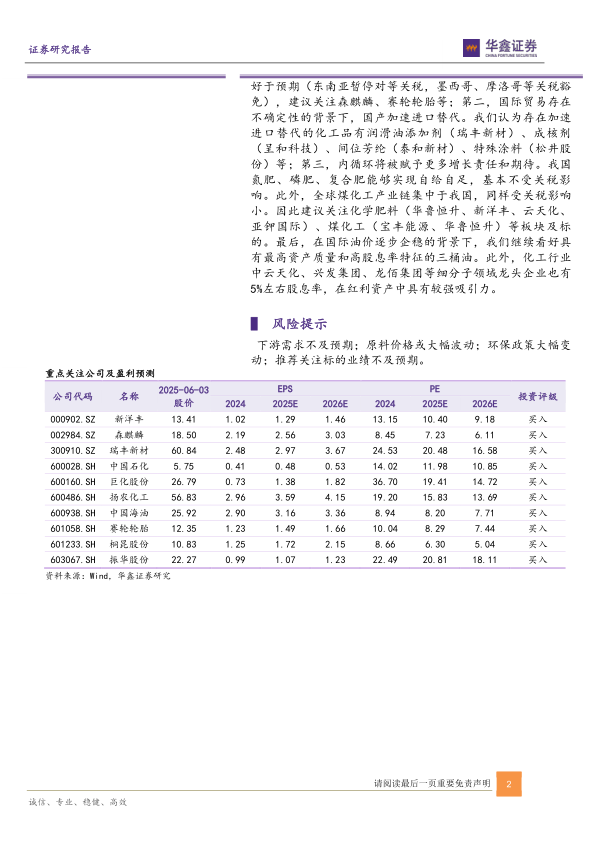 报告认为,在国际贸易存在不确定性的背景下,以及国内内循环战略的推动下,进口替代、纯内需、高股息资产将成为化工行业重要的投资机会。