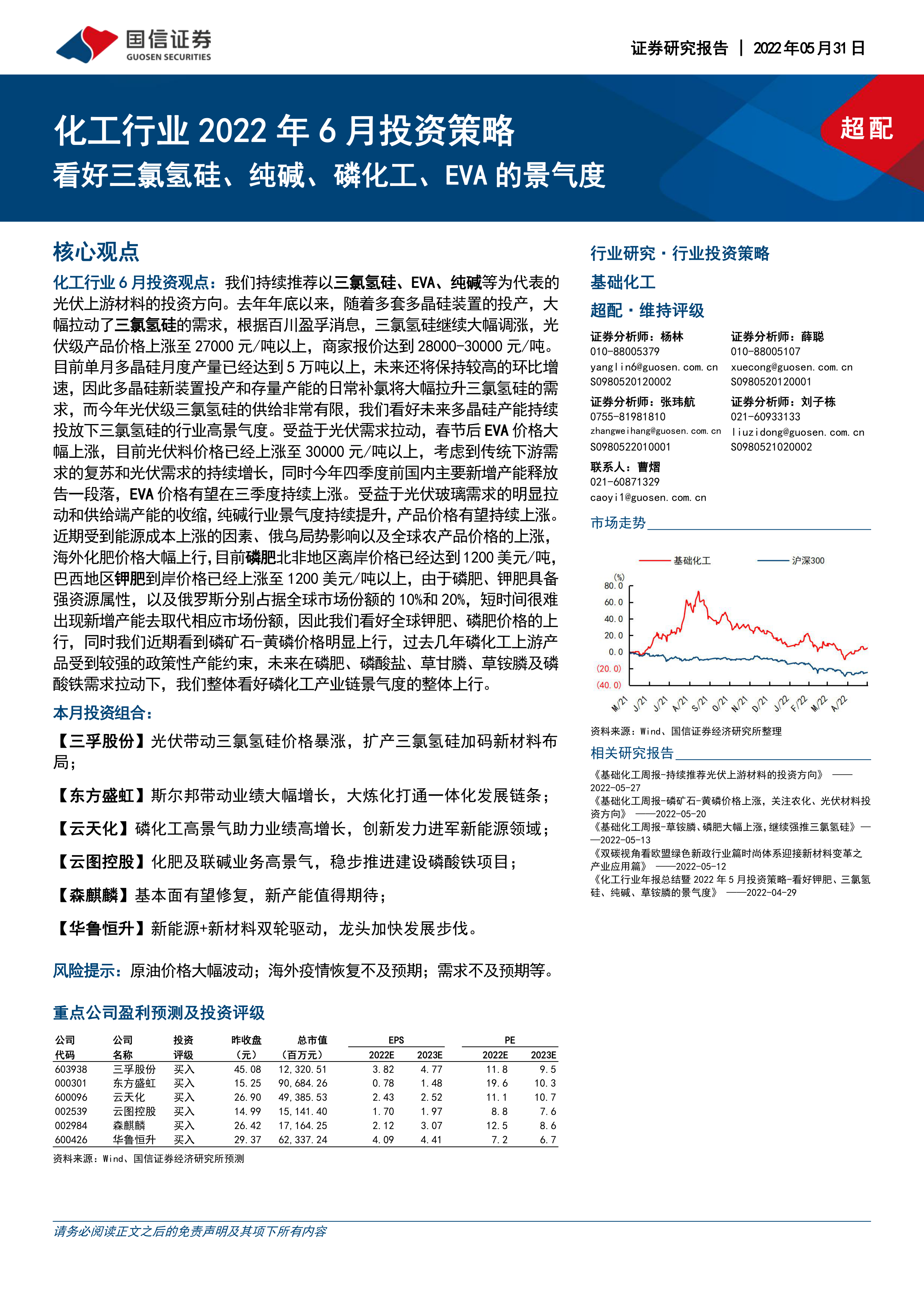 化工行业6月投资观点:我们持续推荐以三氯氢硅、EVA、纯碱等为代表的光伏上游材料的投资方向。去年年底以来,随着多套多晶硅装置的投产,大幅拉动了三氯氢硅的需求,根据百川盈孚消息,三氯氢硅继续大幅调涨,光伏级产品价格上涨至27000元/吨以上,商家报价达到28000-30000元/吨。目前单月多晶硅月度产量已经达到5万吨以上,未来还将保持较高的环比增速,因此多晶硅新装置投产和存量产能的日常补氯将大幅拉升三氯氢硅的需求,而今年光伏级三氯氢硅的供给非常有限,我们看好未来多晶硅产能持续投放下三氯氢硅的行业高景气度。受益于光伏需求拉动,春节后EVA价格大幅上涨,目前光伏料价格已经上涨至30000元/吨以上,考虑到传统下游需求的复苏和光伏需求的持续增长,同时今年四季度前国内主要新增产能释放告一段落,EVA价格有望在三季度持续上涨。受益于光伏玻璃需求的明显拉动和供给端产能的收缩,纯碱行业景气度持续提升,产品价格有望持续上涨。近期受到能源成本上涨的因素、俄乌局势影响以及全球农产品价格的上涨,海外化肥价格大幅上行,目前磷肥北非地区离岸价格已经达到1200美元/吨,巴西地区钾肥到岸价格已经上涨至1200美元/吨以上,由于磷肥、钾肥具备强资源属性,以及俄罗斯分别占据全球市场份额的10%和20%,短时间很难出现新增产能去取代相应市场份额,因此我们看好全球钾肥、磷肥价格的上行,同时我们近期看到磷矿石-黄磷价格明显上行,过去几年磷化工上游产品受到较强的政策性产能约束,未来在磷肥、磷酸盐、草甘膦、草铵膦及磷酸铁需求拉动下,我们整体看好磷化工产业链景气度的整体上行。