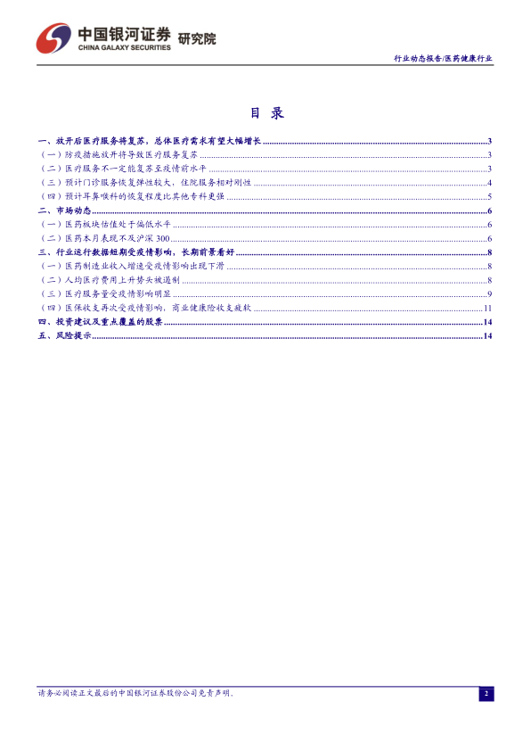 报告列出了潜在的风险因素,包括疫情反复、政策落地不及预期、医保控费降价压力、创新药械研发失败等。