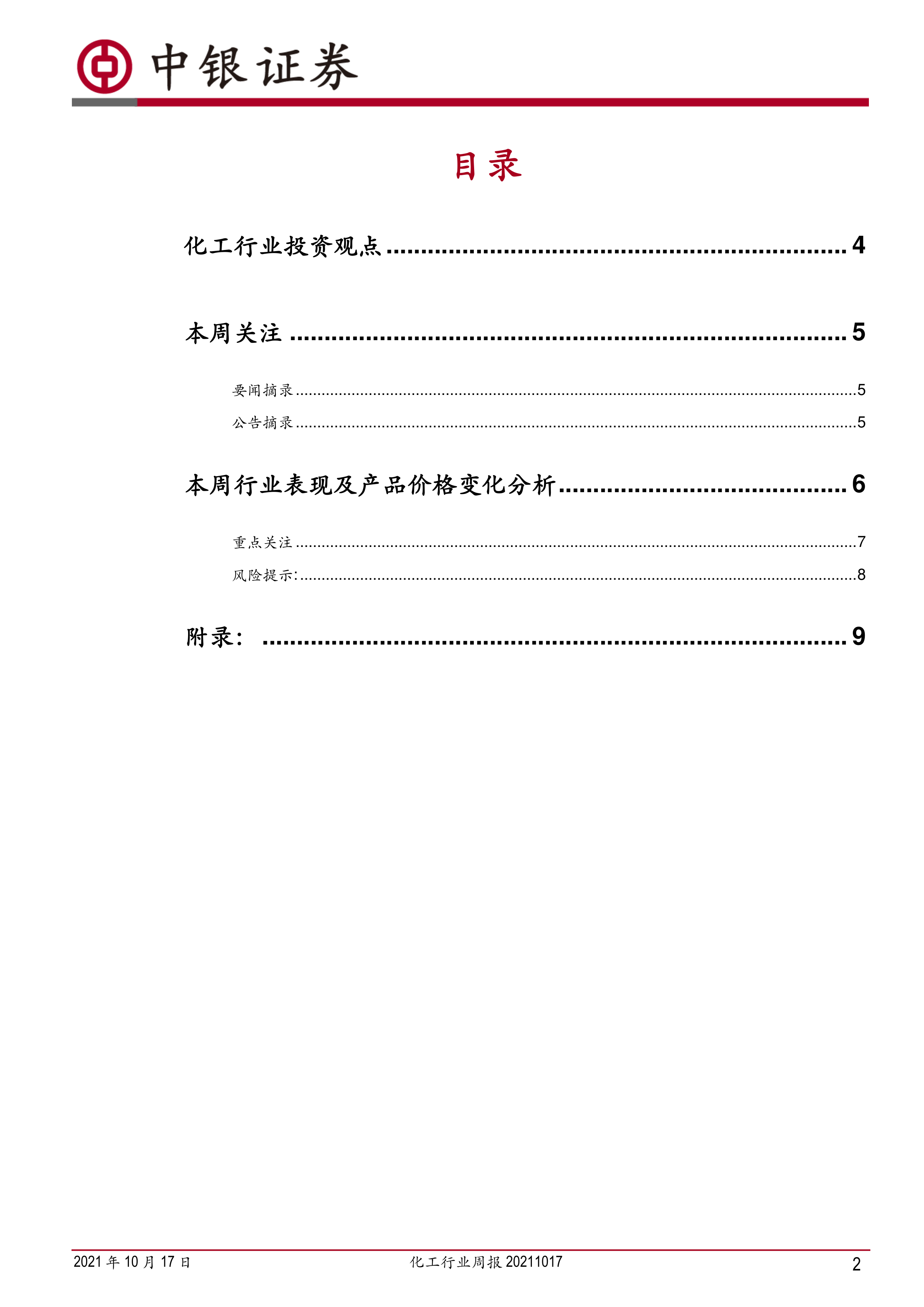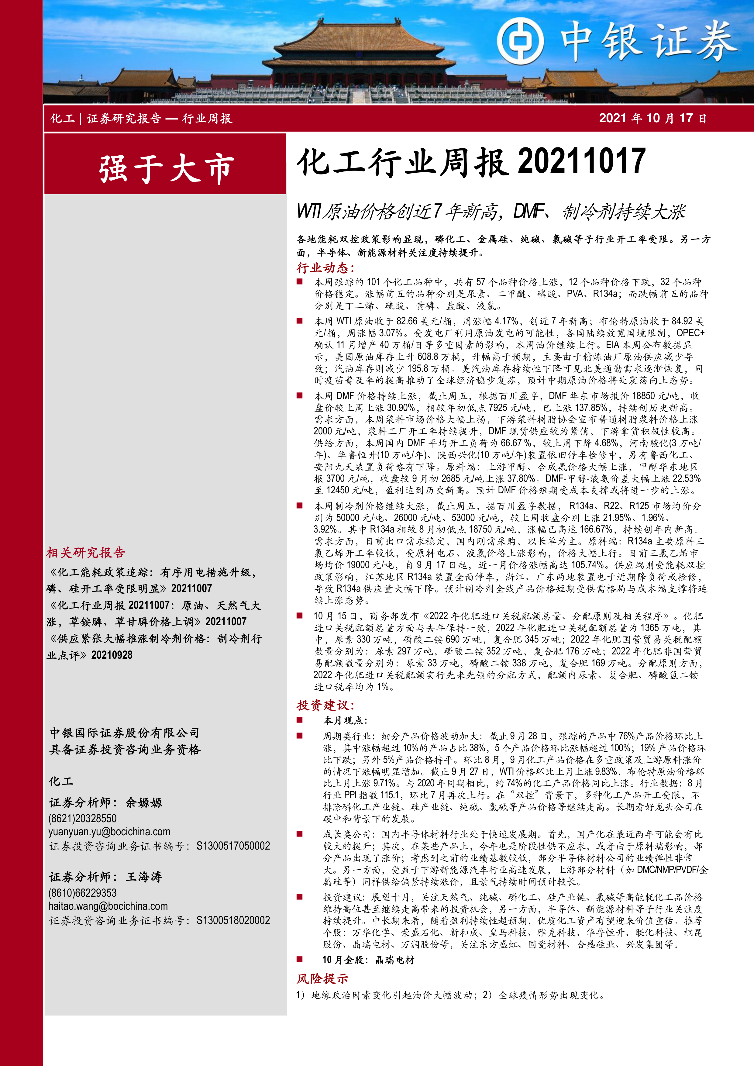 本报告的核心观点是:2021年10月17日当周,化工行业整体表现强于大市,部分产品价格大幅波动。原油价格上涨是主要驱动因素,能耗双控政策则导致部分高能耗产品开工率受限,价格上涨。同时,半导体和新能源材料等领域持续受到关注,发展前景良好。报告建议关注高能耗化工品价格上涨带来的投资机会,以及半导体、新能源材料等领域的长期投资价值。