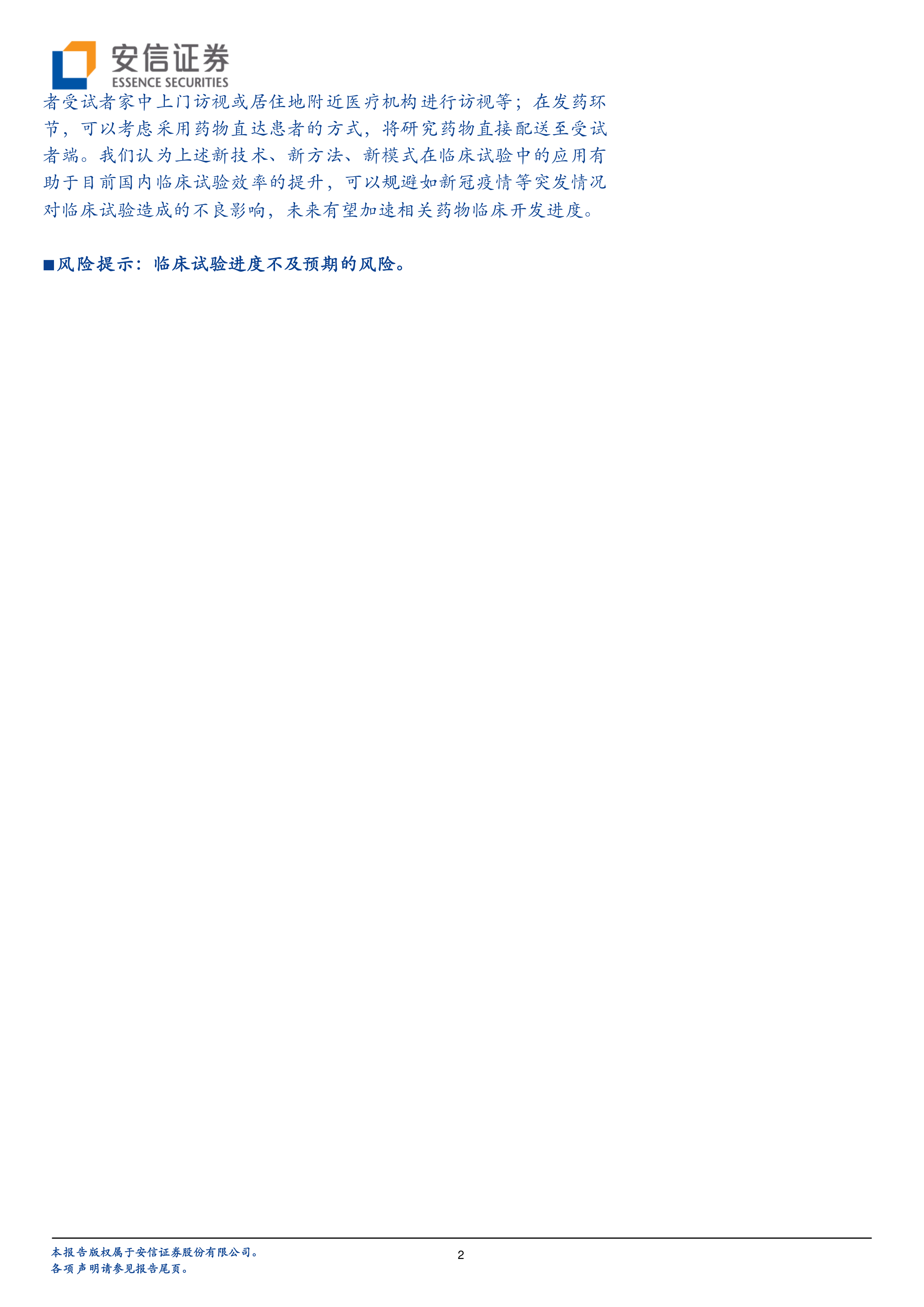 新技术、新方法、新模式有望应用临床试验实施过程中,临床试验效率有望进一步提升。《以患者为中心的临床试验实施技术指导原则(征求意见稿)》中提出了多个以患者为中心的新技术、新方法、新模式应用场景,如在患者招募环节,可采用互联网平台招募、基于患者信息大数据的智能化招募;在患者知情环节,可考虑采用电子知情或远程知情;在访视环节,可考虑采用电话、视频等方式进行远程访视,或者受试者家中上门访视或居住地附近医疗机构进行访视等;在发药环节,可以考虑采用药物直达患者的方式,将研究药物直接配送至受试者端。我们认为上述新技术、新方法、新模式在临床试验中的应用有助于目前国内临床试验效率的提升,可以规避如新冠疫情等突发情况对临床试验造成的不良影响,未来有望加速相关药物临床开发进度。