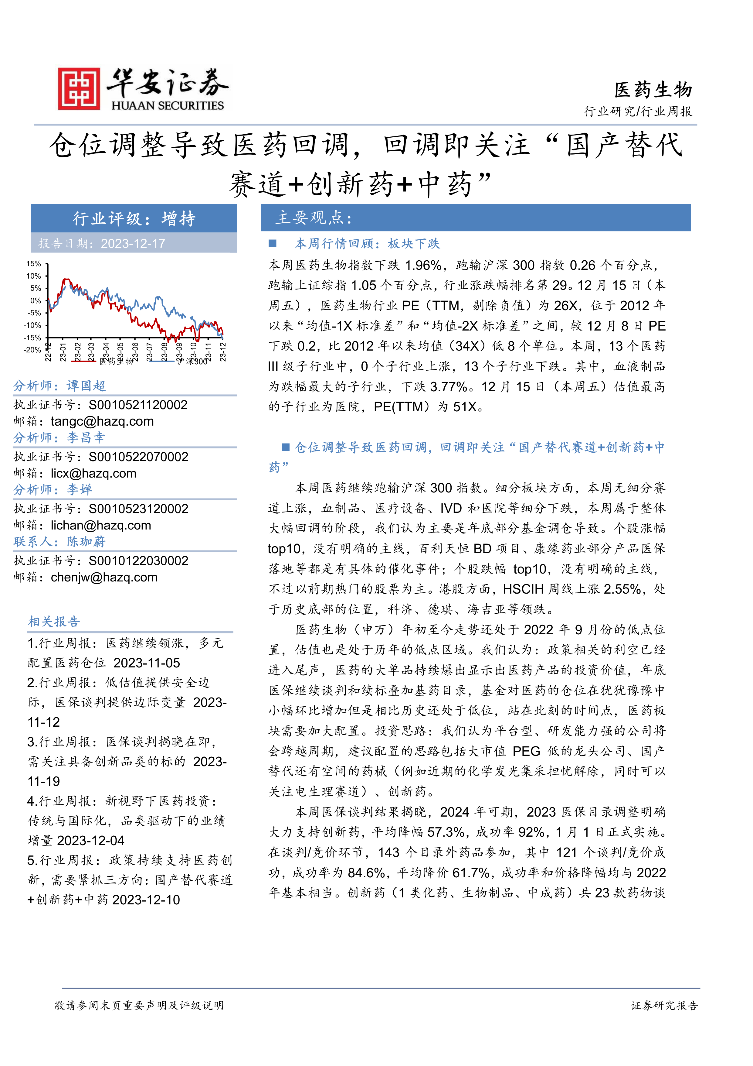 本报告的核心观点是:医药生物板块本周下跌,主要原因是年底基金调仓导致的仓位调整。尽管如此,我们认为政策利空已基本消退,医药板块估值处于历史低位,投资价值凸显。建议关注“国产替代赛道+创新药+中药”三大方向,并重点关注具备平台型优势和强大研发能力的公司。