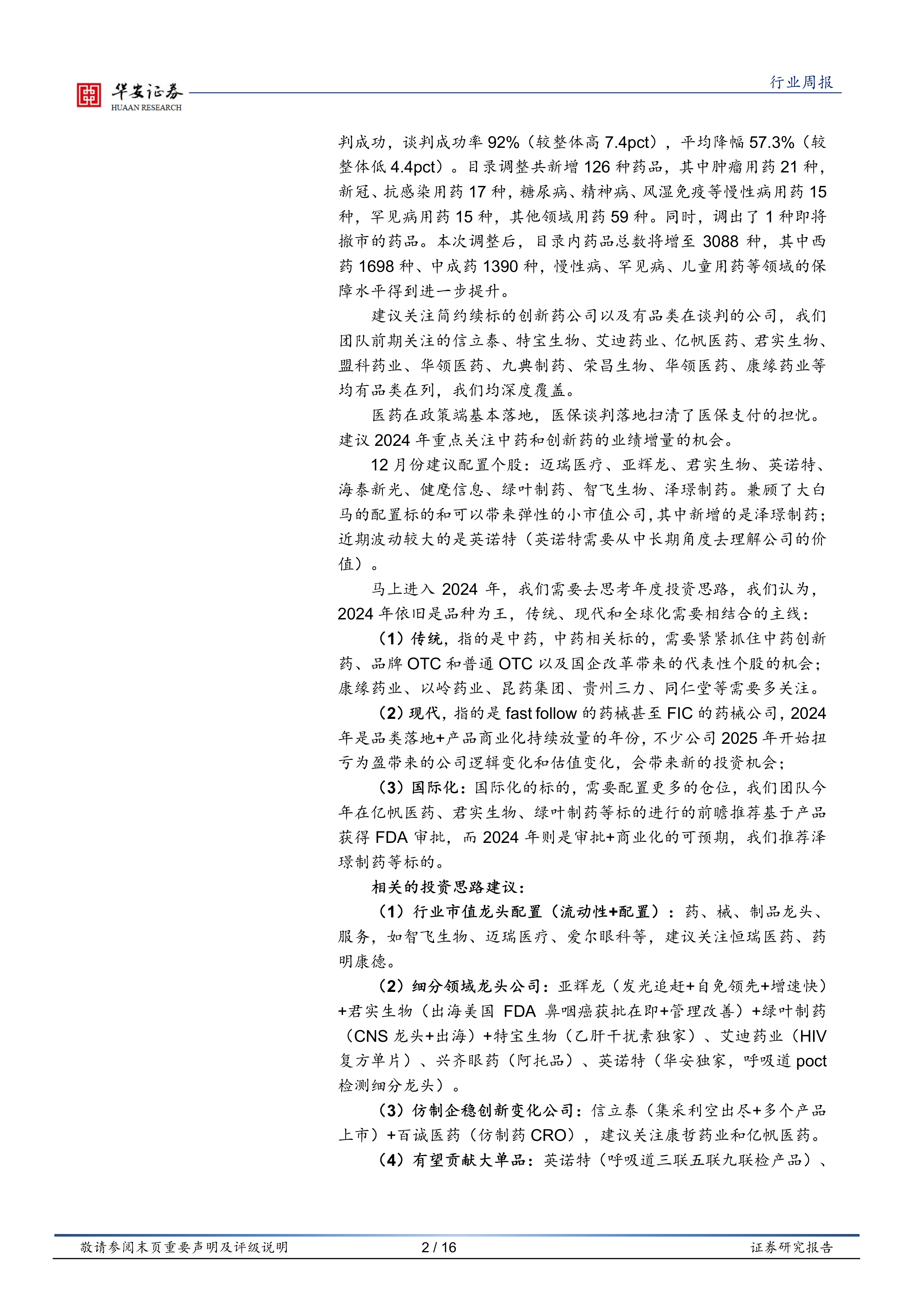 医药在政策端基本落地,医保谈判落地扫清了医保支付的担忧。建议2024年重点关注中药和创新药的业绩增量的机会。